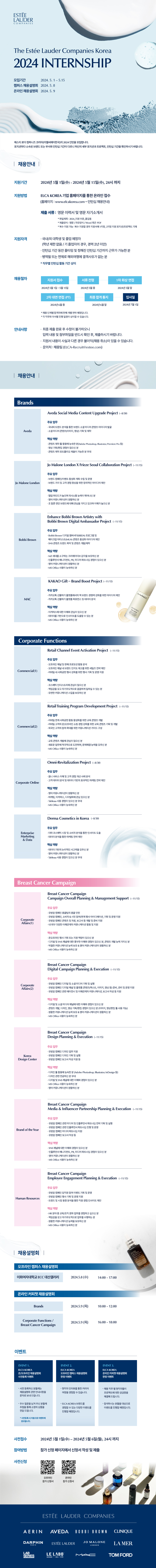 | 제목 | [에스티로더 컴퍼니즈 코리아] 2024 인턴 채용 및 채용설명회(~5/15) | ||||
