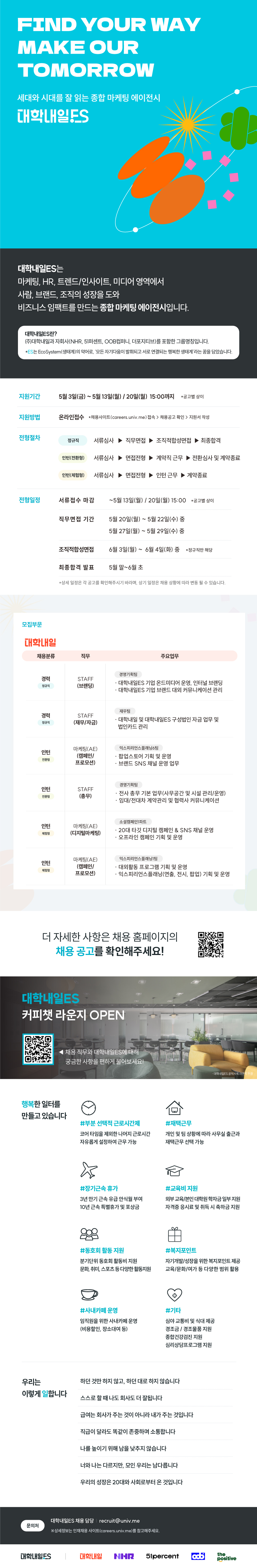 | 제목 | [대학내일ES] STAFF(총무)_인턴(전환형) 및 마케팅AE_인턴(전환형/체험형) | ||||