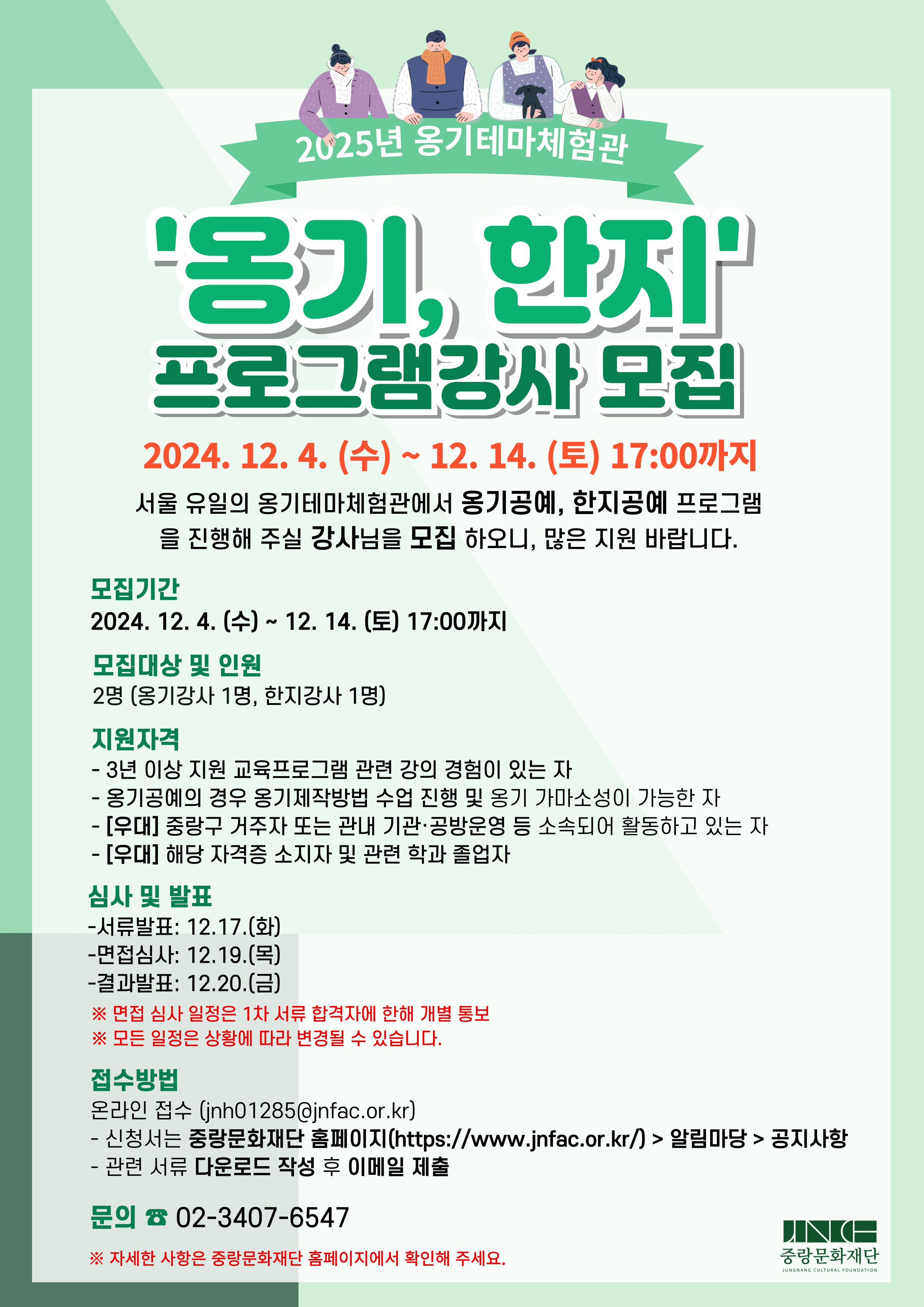 가. 사 업 명: 2025년 옹기테마체험관 체험프로그램(옹기, 한지) 강사모집 나. 모집일정: 2024. 12. 4.(수) ~ 2024. 12. 14.(토) 17:00까지 다. 모집부문: 옹기공예, 한지공예 라. 모집인원: 2명 (각 프로그램별 1명) 마. 지원자격 - 3년 이상 지원 프로그램 관련 강의 경험이 있는 자 - 옹기공예의 경우 옹기제작방법 수업 진행 및 옹기 가마소성이 가능한 자 - [우대] 중랑구 거주자 또는 관내 기관·공방운영 등 소속되어 활동하고 있는 자 - [우대] 해당 자격증 소지자 및 관련 학과 졸업자 바. 접수방법: 온라인 메일 접수(jnh01285@jnfac.or.kr) ※첨부이미지 및 중랑문화재단 홈페이지(공지사항) 참조 (https://www.jnfac.or.kr/) 사. 문 의: 02-3407-6547 옹기테마체험관(화-토 09:00 ~ 18:00)