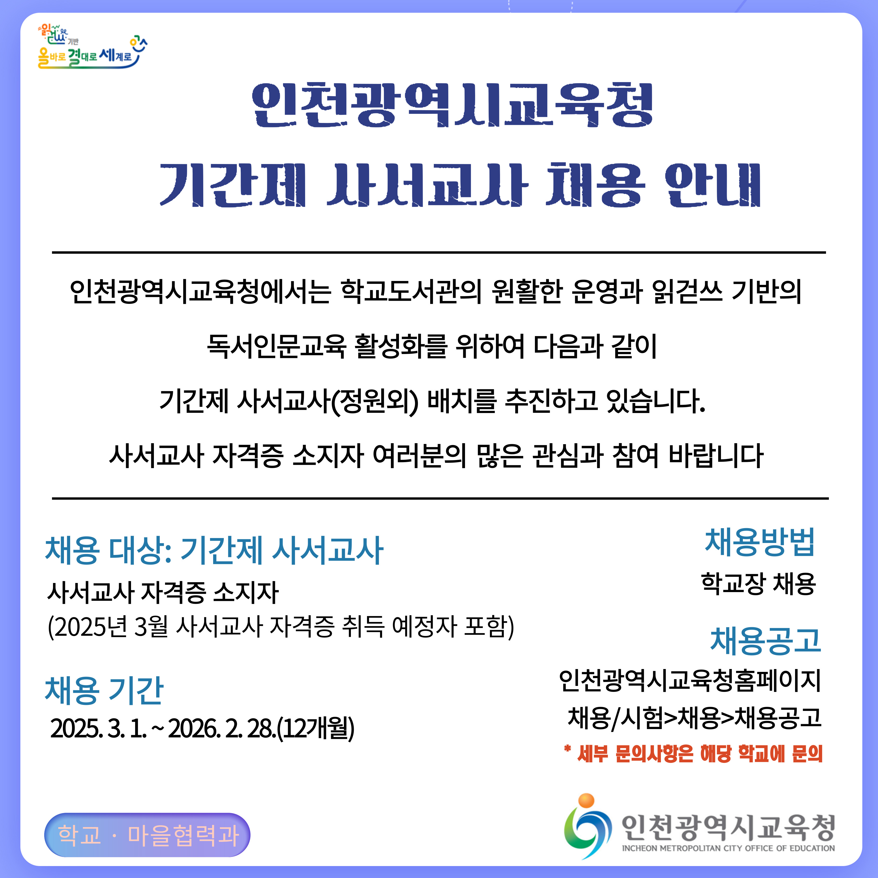 1) 채용 대상: 기간제 사서교사(사서교사 자격증 소지자) 2) 채용 방법: 학교장 채용 3) 계약 기간: 2025. 3. 1. ~ 2026. 2. 28.(12개월) 4) 채용 공고: 인천광역시교육청 채용 공고 참조 ※ 채용 공고문은 해당학교에서 2025. 1월 중 게시 예정