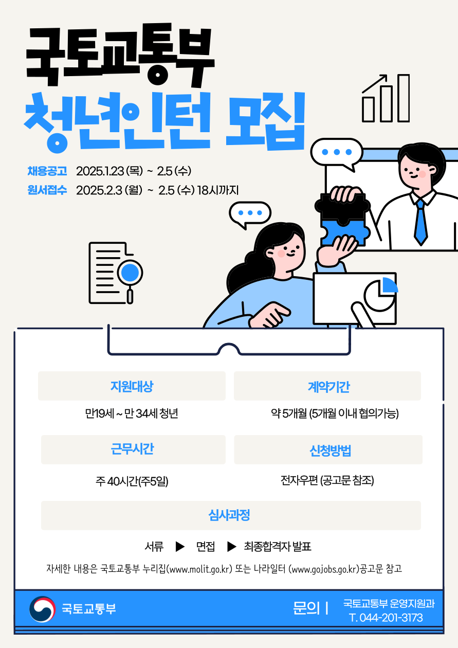 | 제목 | [국토교통부]'25년 상반기 청년인턴 채용(~2/5) | ||||