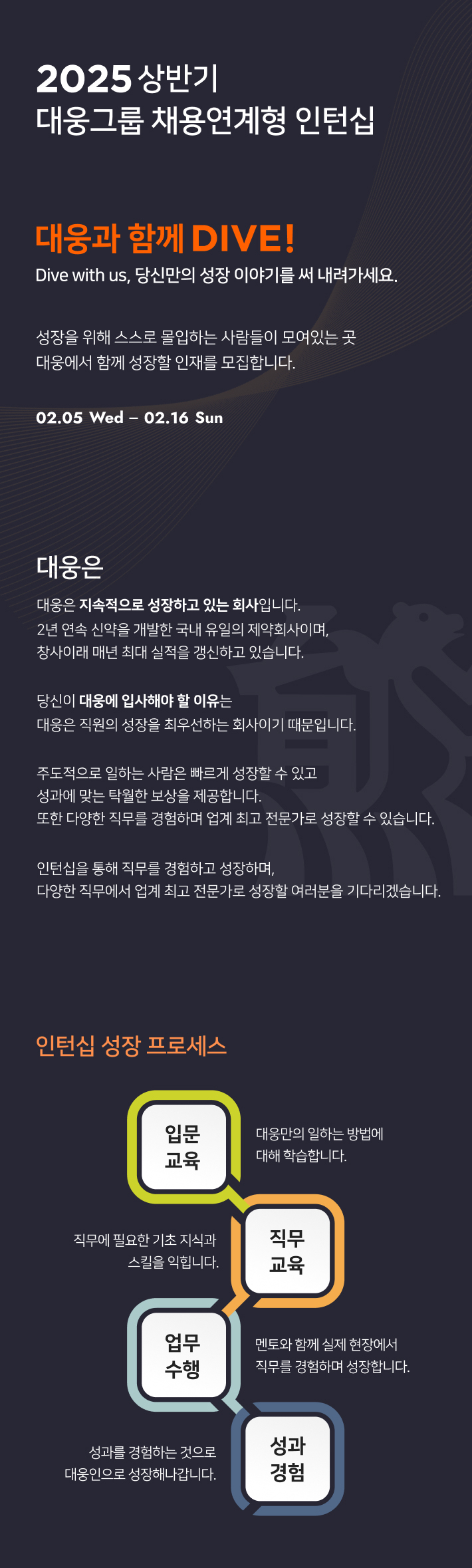 | 제목 | [대웅그룹]2025 상반기 채용연계형 인턴십 채용(~2/16) | ||||