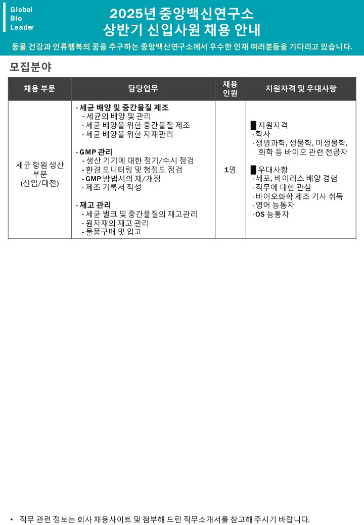 제목 [(주)중앙백신연구소]2025년 상반기 채용(~4/1)