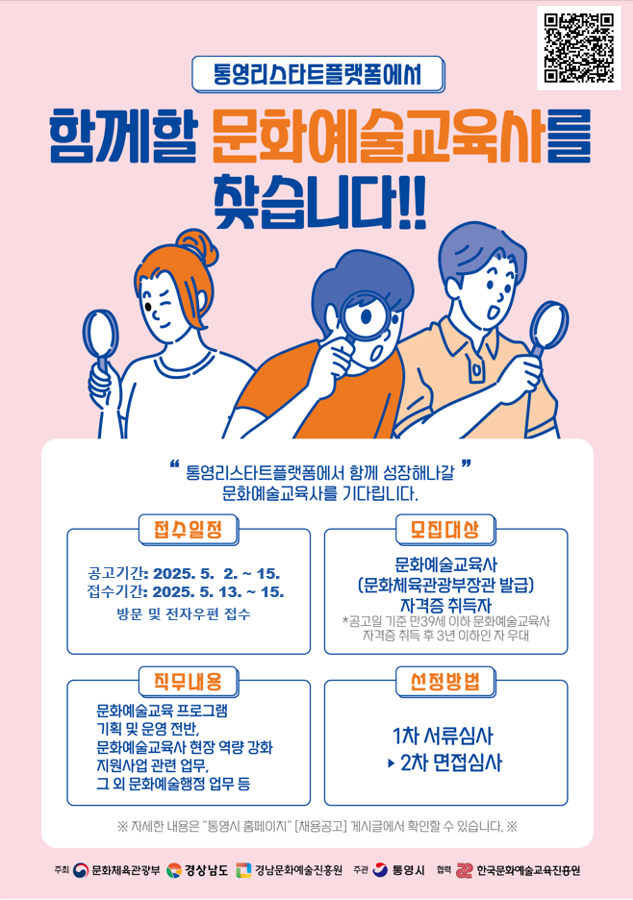 | 제목 | [통영리스타트플랫폼]2025년 문화예술교육사(기간제) 채용(~5/15) | ||||