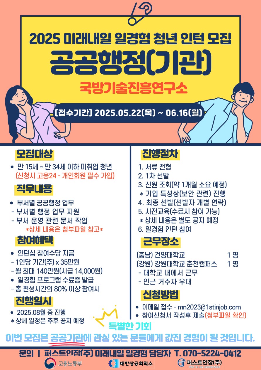 | 제목 | [국방기술진흥연구소]25년 미래내일 일경험 참여자 모집(~6/16) | ||||