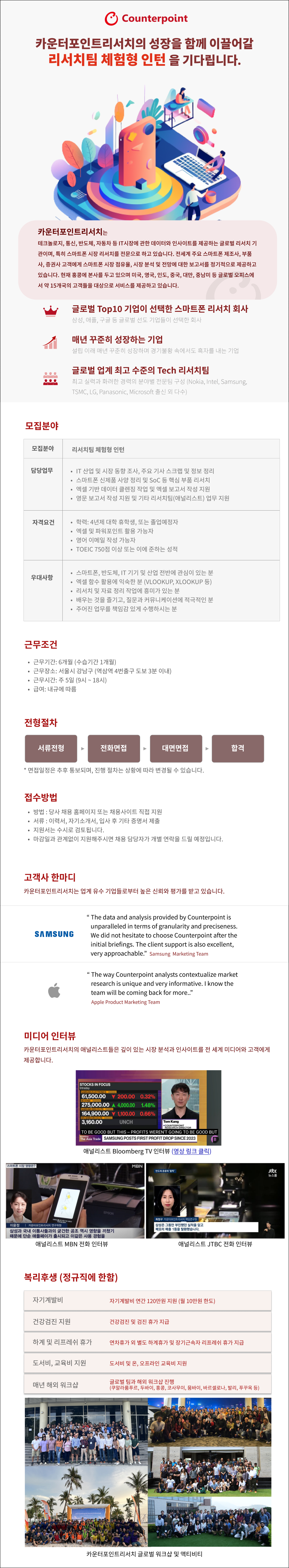 | 제목 | [카운터포인트리서치]리서치팀 체험형 인턴(~1/25) | ||||