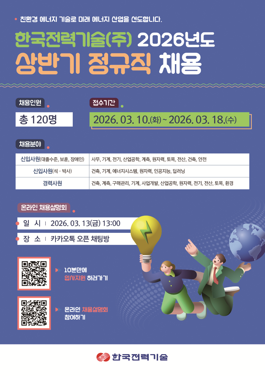 | 제목 | [한국전력기술]2026년도 상반기 정규직 채용(~3/18) | ||||