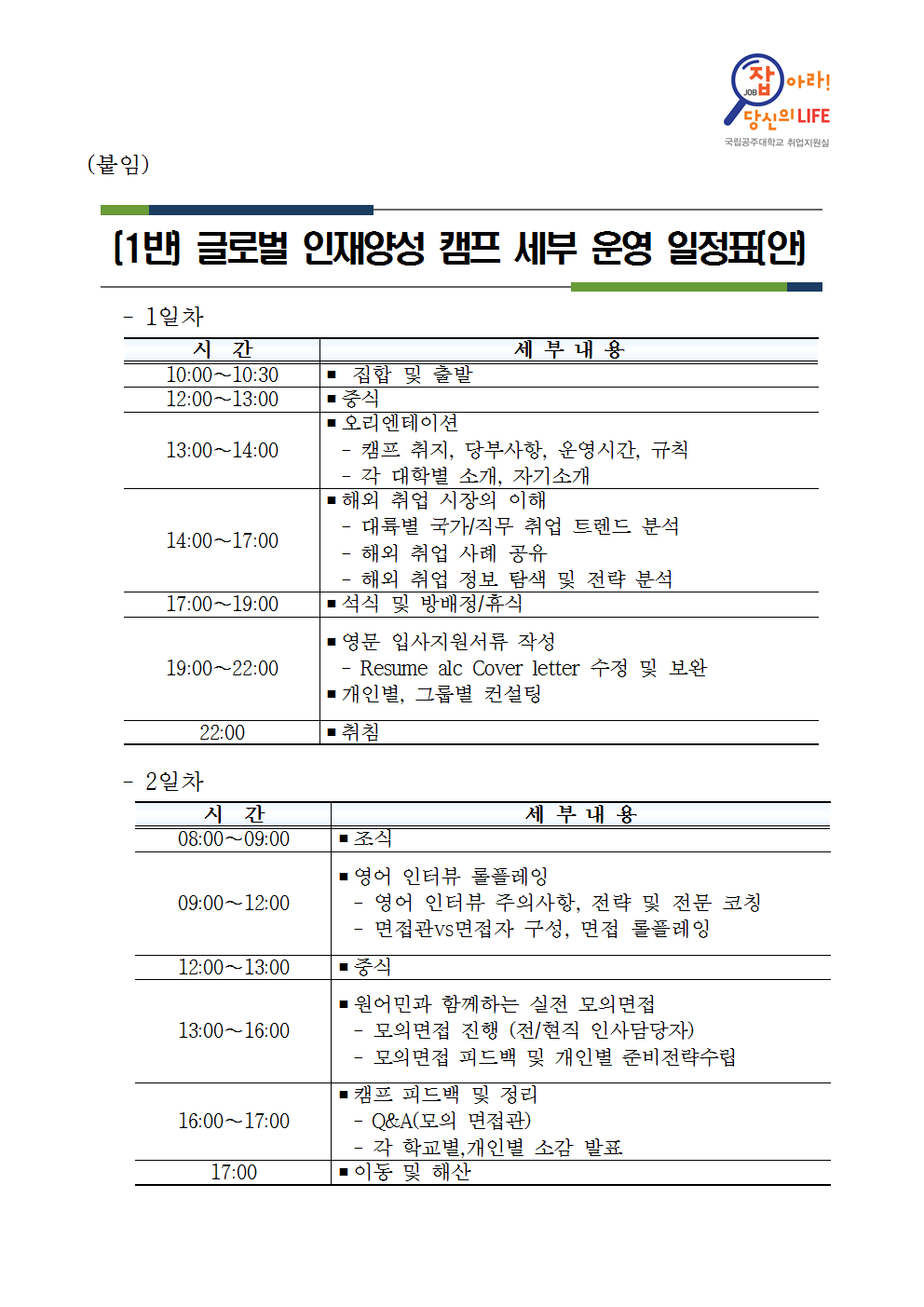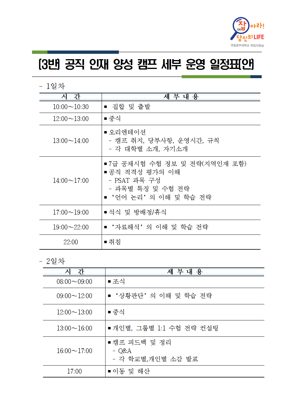 ○ 일시 : 1.29(화)~30(수) / 1박 2일간 ○ 장소 : 외부 전문 연수원 ○ 모집인원 : 총 100명(공주대 재학생 70명, 대전충청권 대학 재학생 30명) ○ 내용 : 3가지 분야로 나누어 진행 (해외취업 중심, 블라인드 면접 중심, 공직인재 양성반 중심) ○ 신청 : 첨부파일의 신청서를 작성하여 이메일 제출(1.22(화) 마감, jobs@kongju.ac.kr) ○ 세부 프로그램 내용 : 첨부파일 참조