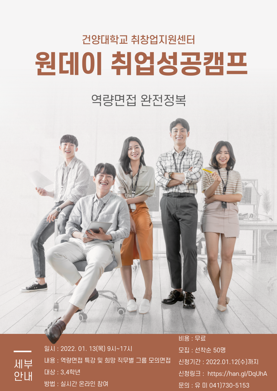 가. 명칭 : 원데이 취업성공캠프(부제 : 역량면접 완전정복) 나. 일시 : 2022. 01. 13(목), 09:00~17:00(7시간) 다. 내용 : 역량면접 특강 및 희망 직무별 그룹 모의면접 라. 대상 : 3,4학년 마. 방법 : 실시간 온라인 참여 바. 비용 : 무료 사. 신청 안내 1) 신청기간 : ~ 2022.01.12(수) 까지 2) 신청방법 : 개별 온라인 신청(URL : https://han.gl/DqUhA) 3) 모집인원 : 선착순 50명