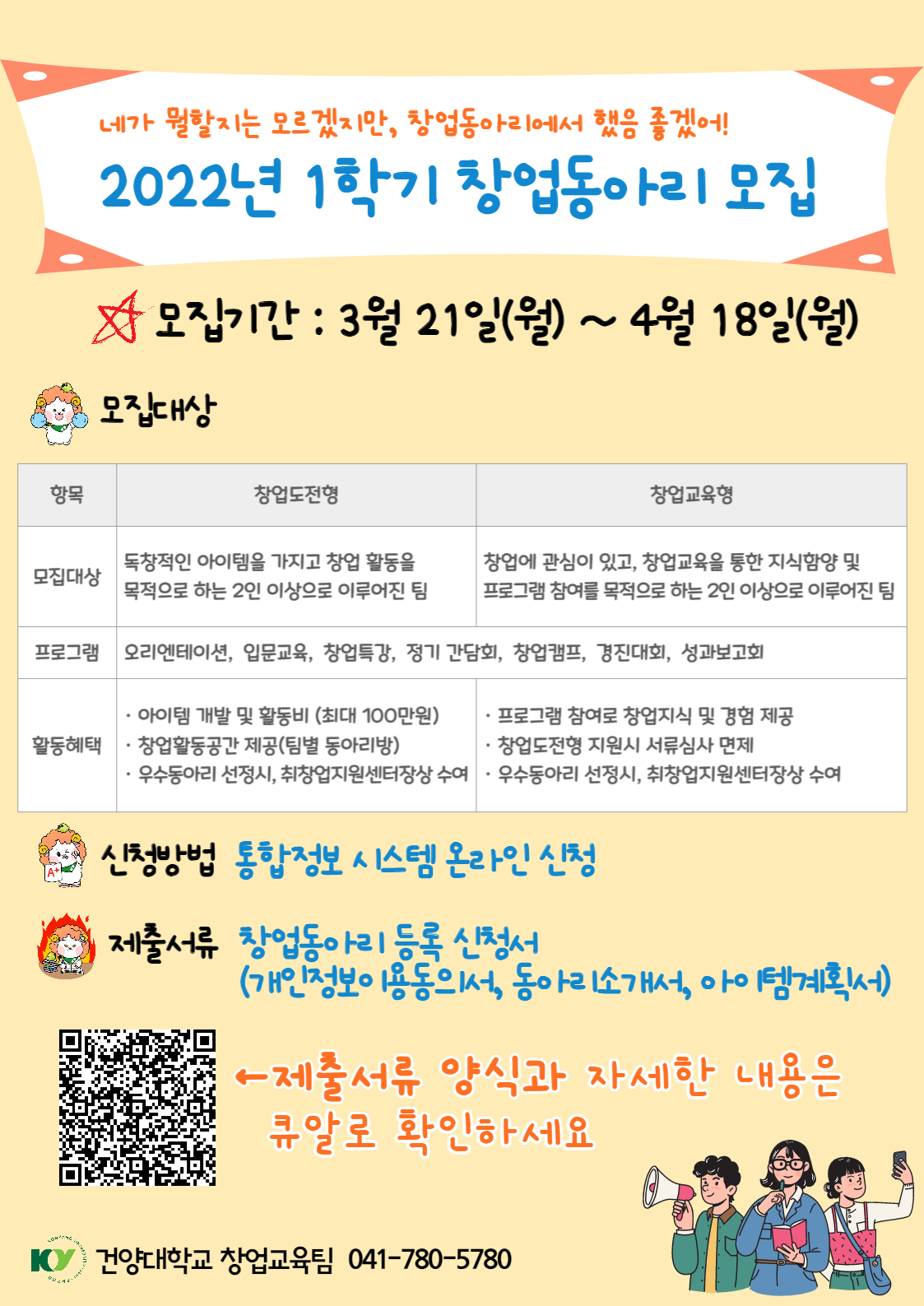 2022학년도 1학기 창업동아리를 모집합니다. 신청서 및 신청방법(통합시스템 신청서 업로드) 및 자세한 내용은 붙임파일을 통해 확인해 주시고, 문의사항은 언제든지 연락 주세요!!