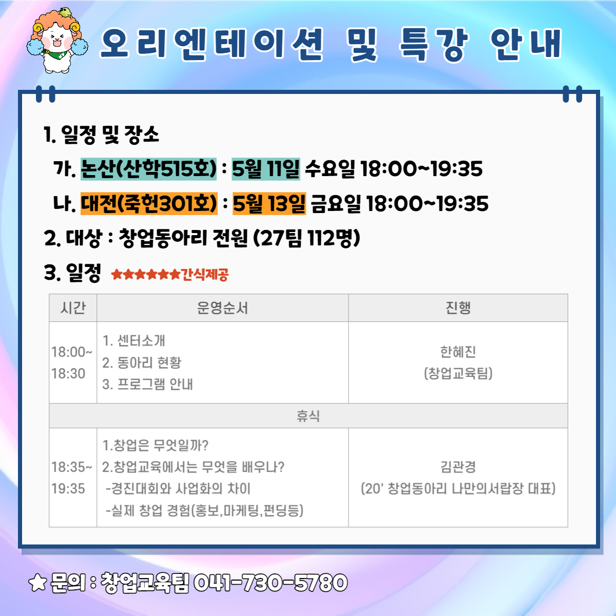 창업동아리 합격팀 안내 및 오리엔테이션(&특강) 공지 글의 상세내용