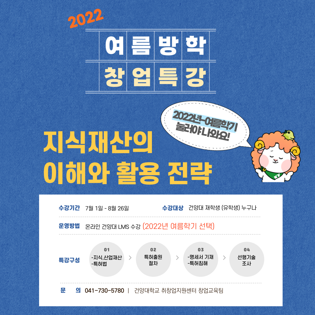 1. 교육제목 : 지식재산의 이해와 활용전략 2. 운영일정 : 2022.07.01.(금)~2022.08.26.(금) 3. 운영방법 : 건양대학교 이러닝 교육 시스템(LMS)_온라인 4. 참여대상 : 건양대학교 재학생(유학생 포함) 5. 문의전화 : 창업교육팀 041-730-5781
