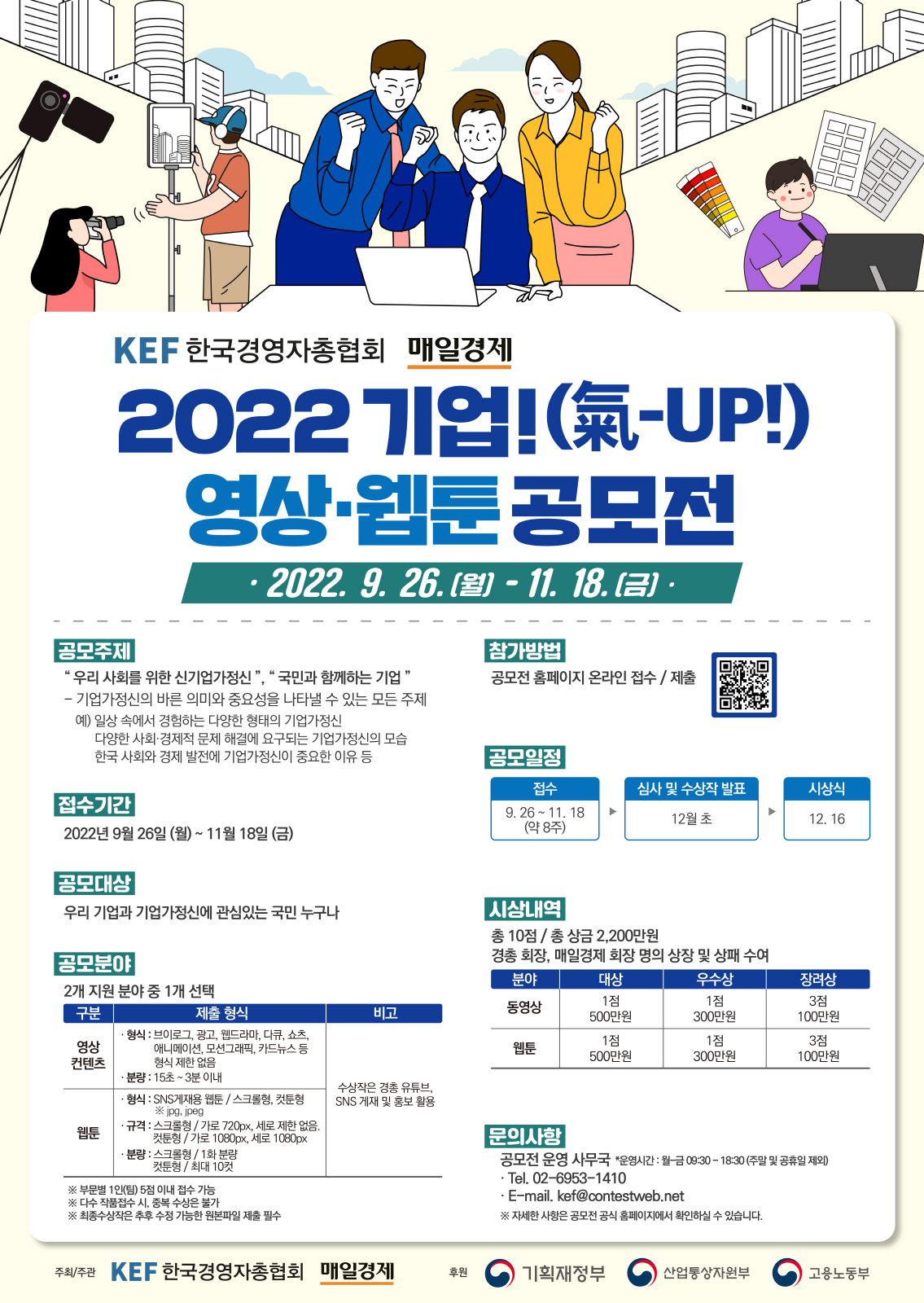 - 참여대상 : 전 국민 (개인 또는 팀(4인 이하)) - 공모부문 : 영상, 웹툰- 접수기간 : ~22. 11. 18. (금) 24:00까지- 공모전 홈페이지 : http://www.spectory.net/kef/kiup/
