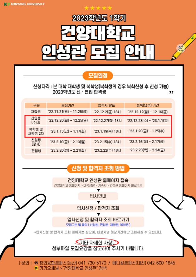 통학버스 안내 https://www.konyang.ac.kr/bus/sub02_00.do 교내장학금 안내 https://www.konyang.ac.kr/kor/sub06_02_01_01.do 건양대학교 기숙사(인성관) https://insung.konyang.ac.kr/insung.do#popup (중요)예비 신입생 기숙사(인성관) 입사는 12.25(일) 이후로도 전화 신청이 가능합니다. 건양대학교 기숙사(인성관) 041)730-5170