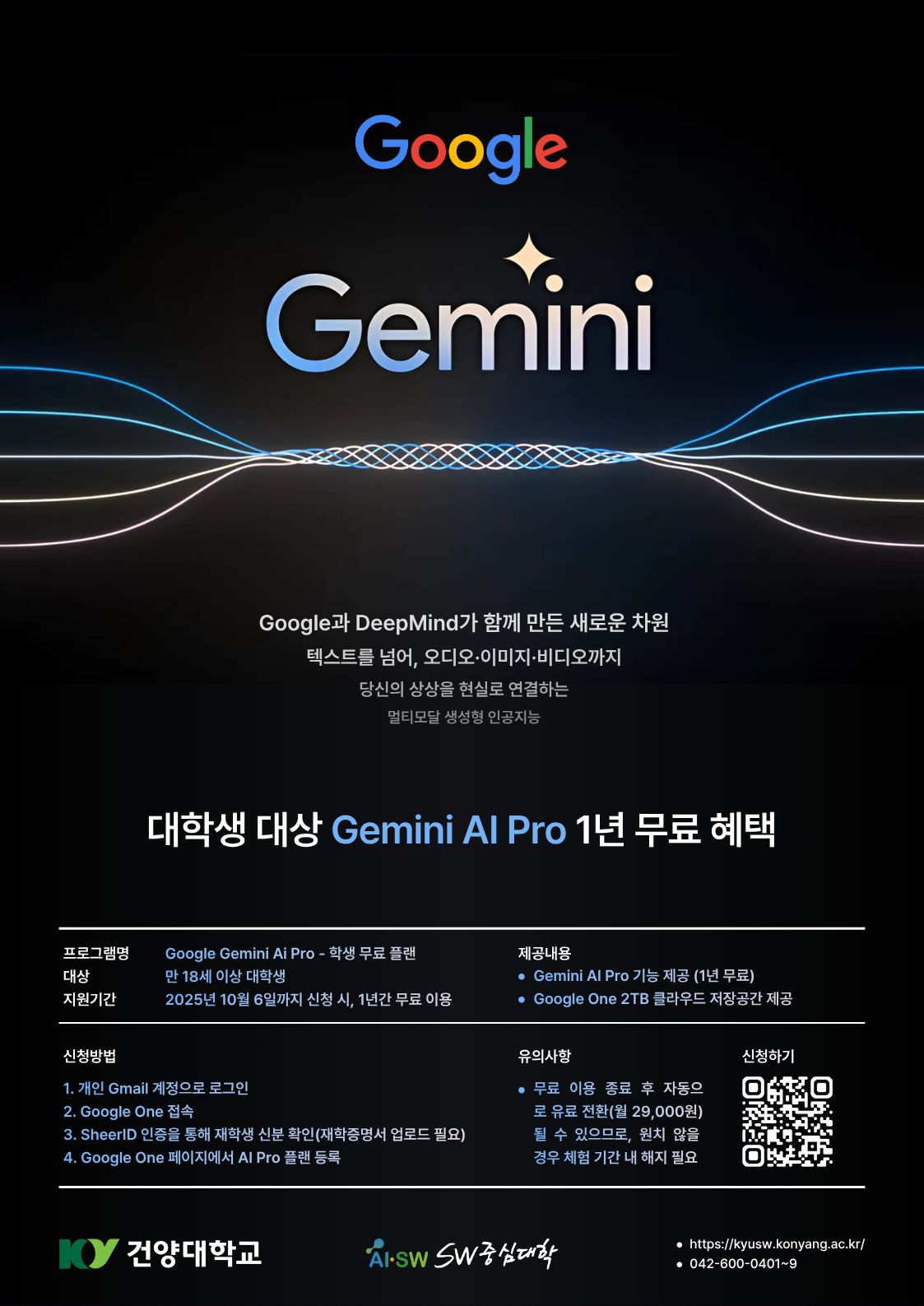 | 제목 | [안내] Google Gemini AI Pro 대학생 무료 이용 안내 | ||||