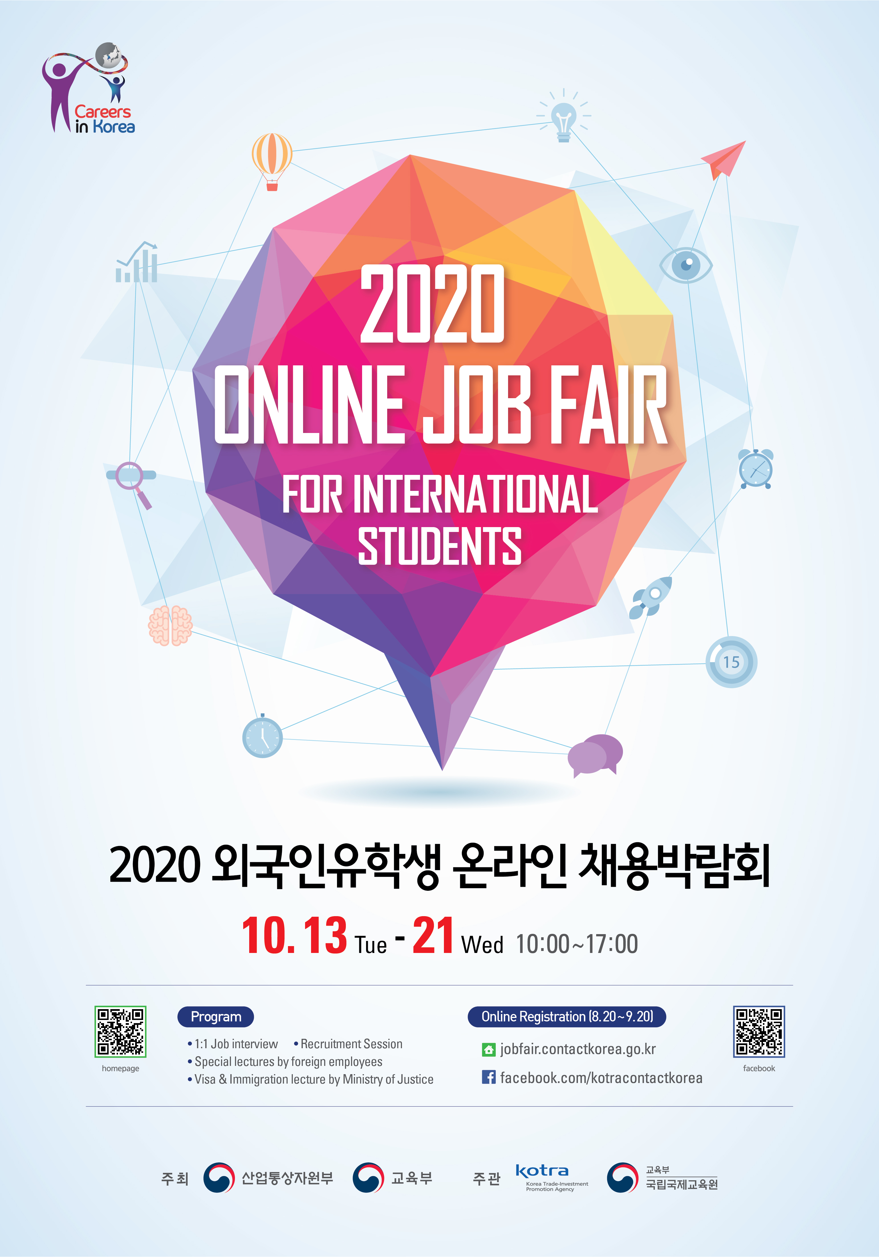 [2020 외국인 유학생 온라인 채용박람회] 가. 행 사 명 : 2020 외국인 유학생 온라인 채용박람회 (Online Job Fair for Int’l Students 2020) 나. 일 시 :'20.10.13.(화)~10.21.(수) 다. 규 모 : 국내기업 60여개사 ※ 주요 참가기업 : 포스코, 네오위즈, 아모레퍼시픽, 한스바이오매드, 동양피스톤, 센트랄, 동원시스템즈 라. 주요행사 : 국내 참가 기업과의 온라인 1:1 상담 및 채용 화상 면접 / 취업 선배 토크 콘서트 및 취업 멘토링, 기업체 설명회 및 체류 비자 특강 등 ※ 당일 면접 신청 불가하며, 반드시 온라인으로 사전 신청해야 함 (사전 신청자 중 면접대상자로 선정된 자는 채용기업과 사전 혹은 행사기간 1:1 면접)