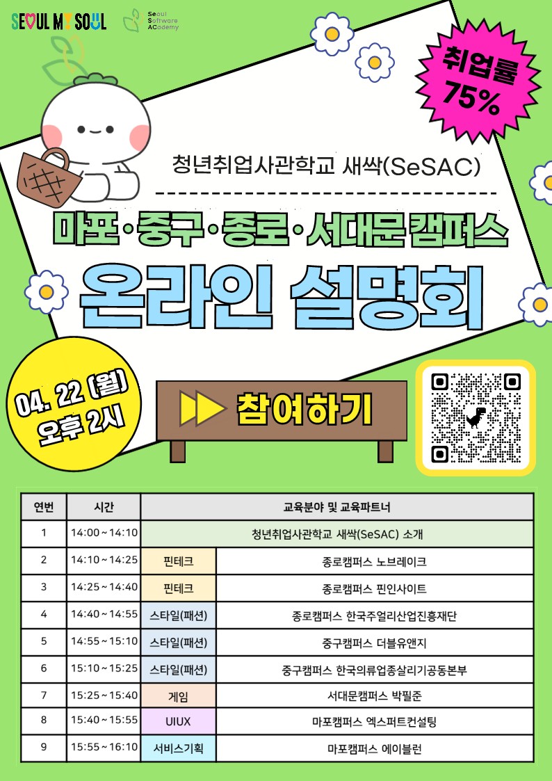 나. 설명회 안내 ❍ 설명회 주소 (변경) : https://us06web.zoom.us/j/89066664220 ❍ 설명회 일시: 2024. 04. 22.(월) 오후 2시 ❍ 평균 취업률 75% 달성한 교육으로, 교육 종료 후 적극적인 취업 연계(각종 기업과 연계한 매칭데이, 잡코디 운영 등)까지 진행하는 과정입니다. 현재 서울시내 15개 캠퍼스가 운영 중에 있으며, 2024년까지 추가로 5곳이 개관할 예정입니다. 귀 대학의 학생들이 온라인 설명회에 참여할 수 있도록 홍보 부탁드립니다. ❍ 문의처: SBA 교육2팀 유지영 책임(마포캠퍼스, 02-2078-2182, jiyoung@sba.seoul.kr) SBA 교육2팀 김원진 선임(중구/종로캠퍼스, 02-2078-2187, kwj33@sba.kr) SBA 교육2팀 김가희 선임(서대문캠퍼스, 070-8879-0911, gaeling@sba.seoul.kr) 다. 교육생 모집·선발 개요 ❍ 모집 일정: 2024. 04. 29.(월) 까지 ※과정별 상이 ❍ 분야/규모: 핀테크, 스타일, 게임, 서비스기획, UIUX 등 5개 분야 10개 과정 230명 * 과정별 교육운영 기관은 분야별 국내 최고 수준의 우수한 기관을 선발하여 교육 운영 ❍ 모집 대상: 분야별 기초지식(레벨)을 갖춘 만 15세 이상의 서울시민(주소지 등록기준)으로, 과정 수료 직후 개발자로서 일자리(취·창업) 활동을 하고자 하는 분 ❍ 지원 방법: 새싹 홈페이지(https://sesac.seoul.kr/)를 통한 온라인 접수 ❍ 선 발: 기초지식(레벨)테스트와 면접은 필수 * 세부적인 사항은 각 교육운영 주체의 기준에 따라 개별 선발, 이전 새싹 참여자도 1회 추가로 참여가 가능(단, 2회 초과 참여는 불가능, 동일 기수/동일 기간 내 중복 참여 불가능) ❍교 육 비: 무료. 단, 교육비의 2% 수준을 예치금을 선납하고, 수료(교육 시간의 80% 이상을 이수 또는 교육시간의 30% 이상을 이수 한 이후 조기 취업한 경우)후 반환함 ❍ 교육생 선발 가점 - 우대대상 (1)서울특별시 청소년부모 가정 지원에 관한 조례에 따른 ‘청소년 부모’(부모 모두 만 24세 이하, 청소년 한부모 포함) (2)서울특별시 자립준비청년의 자립 지원에 관한 조례에 따른 ‘자립준비청년’ (3)서울특별시 사회적 고립청년 지원에 관한 조례에 따른 ‘사회적 고립운둔청년’ - 우대내용: (1) 레벨테스트(5점), 면접(5점) 가점 부여, (2) 예치금 면제 * 대상여부 확인 결과, 대상자가 아닌 경우 우대내용 적용하지 않음 라. 새싹 교육과정의 특징 ① 400개가 넘는 기업 현장에서 실제 필요로 하는 과정과 커리큘럼을 구성했습니다. ② 검증된 교육기관과 현업 실전고수로부터 개발역량을 무료 전수를 받을 수 있습니다. ③ 기본역량(분야-직무-스택)뿐만 아니라 코드리뷰, 멘토링, 동료학습, 실전프로젝트를 통해 특화/응용역량까지 충분히 경험하실 수 있습니다. ④ 과정 이후에는 직접 현장 수요기업과 연결하여 취업과정을 적극적으로 돕습니다.