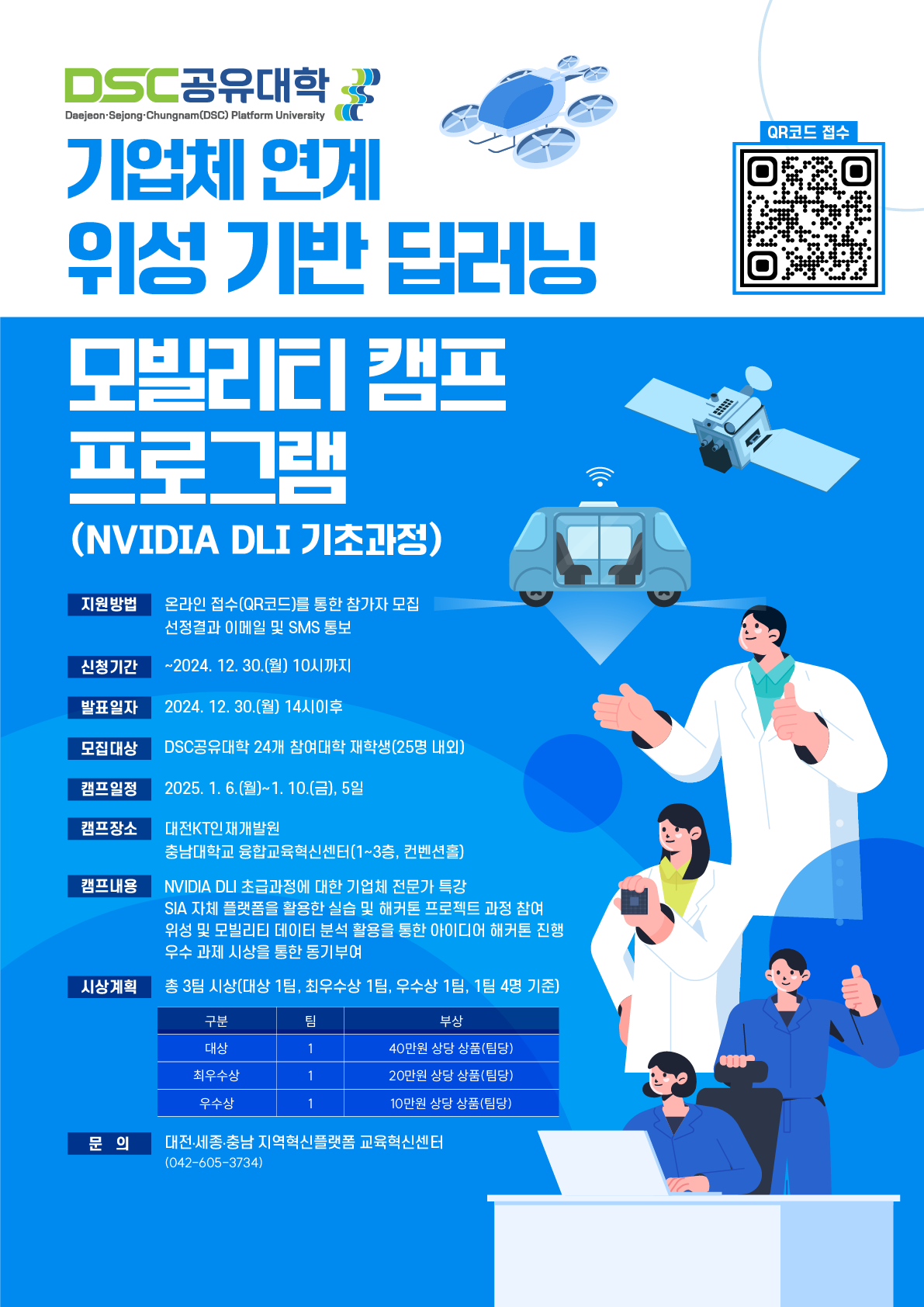 가. 주 관: 대전·세종·충남 지역혁신플랫폼 대학교육혁신본부 나. 프로그램: DSC공유대학 기업체 연계 위성 기반 딥러닝 모빌리티 캠프 프로그램(NVIDIA DLI 기초과정) 다. 모집인원: DSC공유대학 재학생 및 대학원생 25명(선착순) 라. 모집일정: ~ 2024. 12. 30.(월) 10시 까지 ※ 선정발표는 ~ 2024. 12. 30.(월) 14시 이후 마. 수업일정: 2025. 1. 6.(월) ~ 1. 10.(금), 5일 바. 장 소: KT대전인재개발원, 충남대학교 융합교육혁신센터(1~3층, 컨벤션홀) 사. 참여혜택: 식사(조식, 중식, 석식)제공, DSC공유대학 마일리지 지급(추후 장학금 지급), 시상품(대상 40만원 1팀, 최우수상 20만원 1팀, 우수상 10만원 1팀) 아. 참여방법: 링크 접속(https://forms.gle/mEXxZZsKnXKGRDvv9) 자. 요청사항:【붙임 1, 2】을 활용하여 대학 홈페이지 및 각 학과별 게시판 또는 알림톡 홍보 차. 문 의 처: DSC 지역혁신플랫폼 대학교육혁신본부 교육혁신센터 융합교육팀 (042-605-3734, cmh1107@cnu.ac.kr)