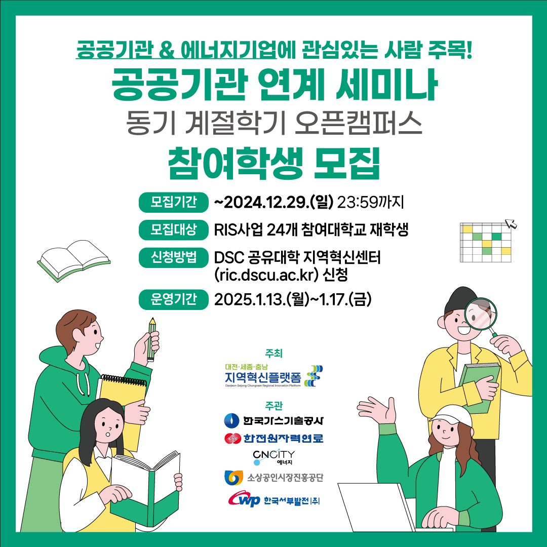 가. 사 업 명: 광역 오픈캠퍼스 나. 운영기간: 2025. 1. 13.(월) ~ 1. 17.(금), 13:00~16:00 다. 대 상: 지자체-대학 협력기반 지역혁신사업 24개 참여대학 재학생 라. 운영내용: 기관 소개 및 현장견학, 취업멘토링 등 취업역량 향상 교육 마. 선발인원 및 방법 1) 선발인원: 총 40명 2) 선발방법: (학생) 센터 홈페이지 온라인 신청서 지원 → (센터) 자체평가 및 선발 → (기관) 과정 운영 바. 지원내용: 협력기관 기관장 공동명의 수료증* 발급 예정 *출석률 등 일정 기준 충족 시 사. 운영과정 및 세부일정: 【붙임 1】 참조