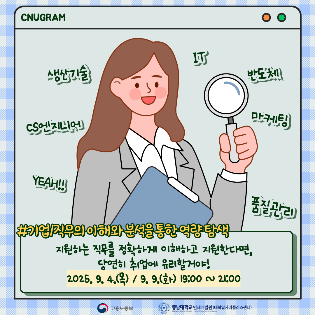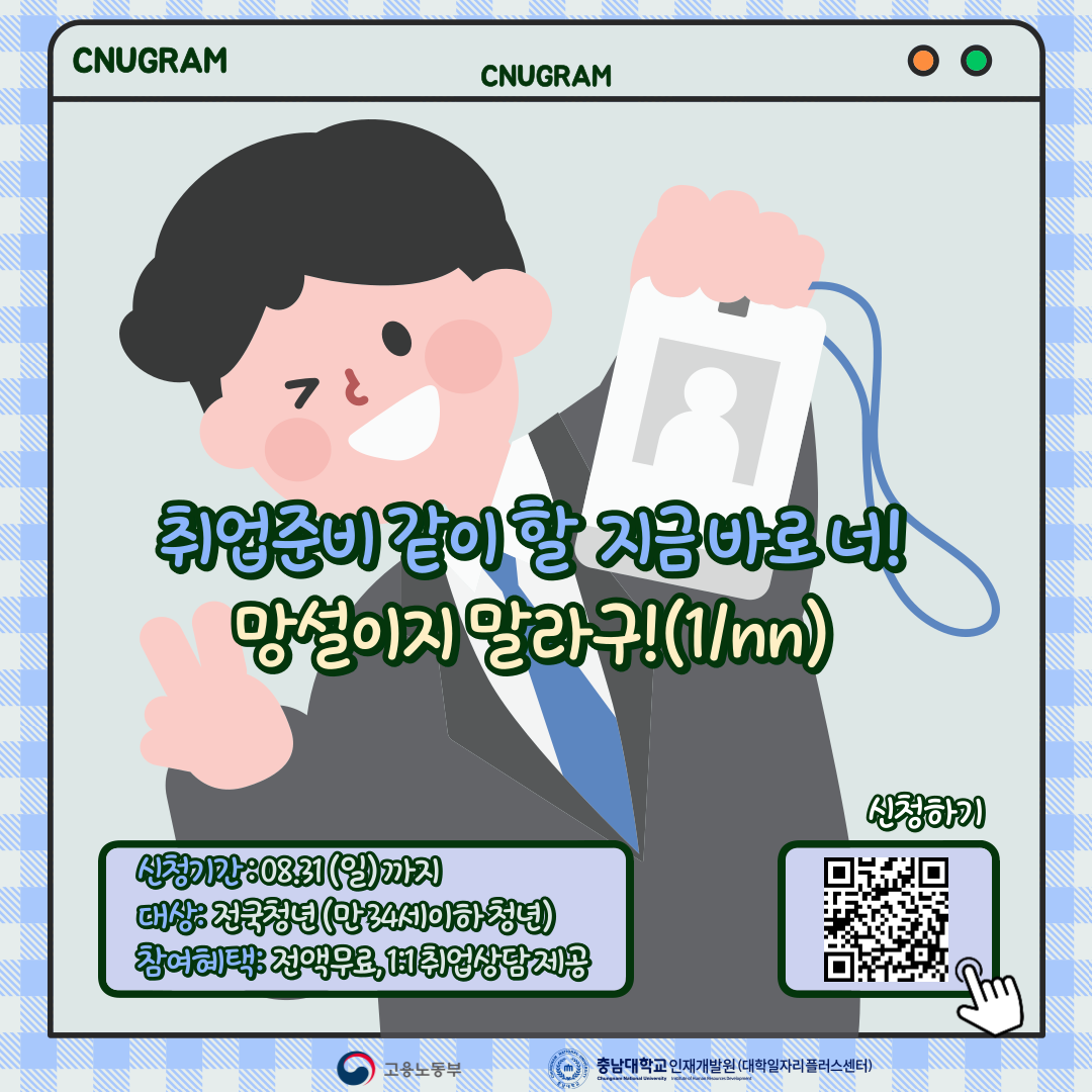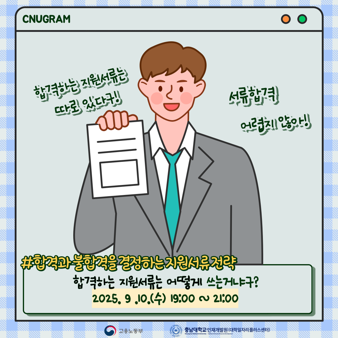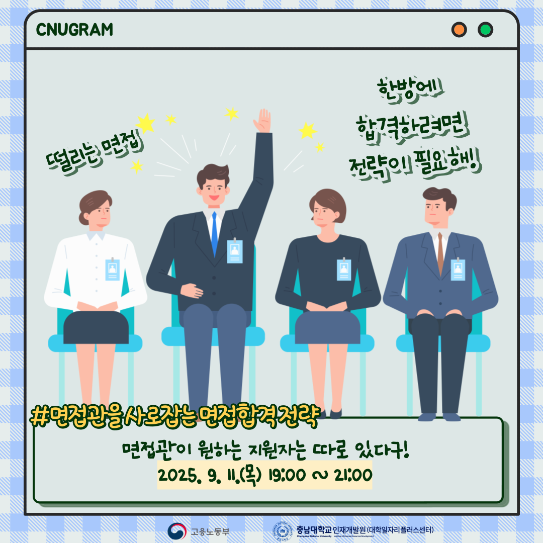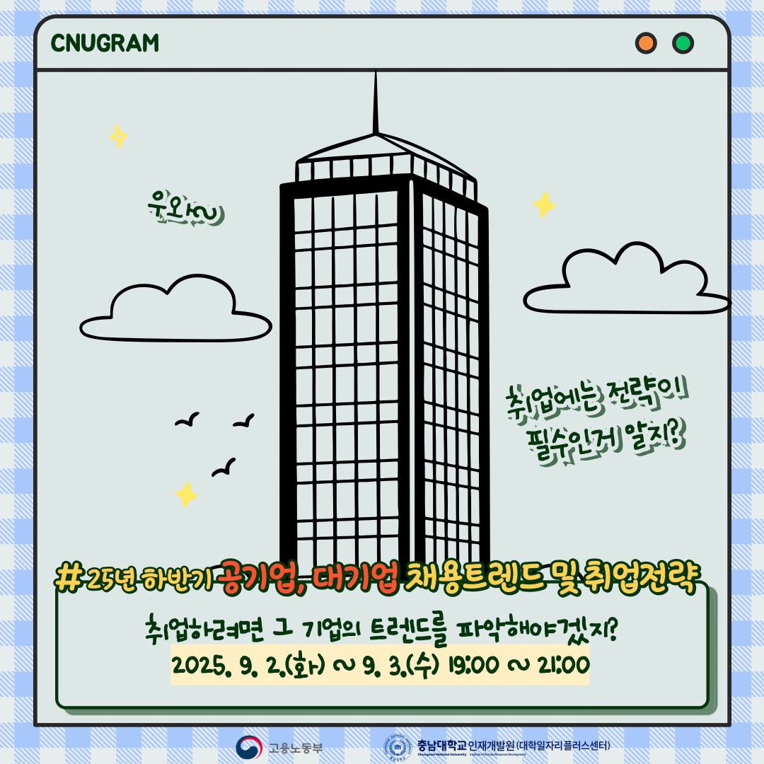 1. 교육개요 가. 기간: 2025. 9. 2.(화)~9. 11.(목) 19:00~21:00 나. 대상: 만34세 이하 청년 다. 방법: 비대면 특강 라. 주요내용 1) 공공․일반기업 채용트렌트 및 취업 전략 수립 2) 기업 및 직무 이해와 분석, 입사지원서 작성 및 면접 전략 2. 신청방법 및 기간 가. 신청기간: 2025. 8. 11.(월)~8. 31.(일) 나. 신청방법: 구글폼 신청(https://forms.gle/H129ZU9mDyN9kSvh8) ※ 프로그램 과정별 중복 신청 가능