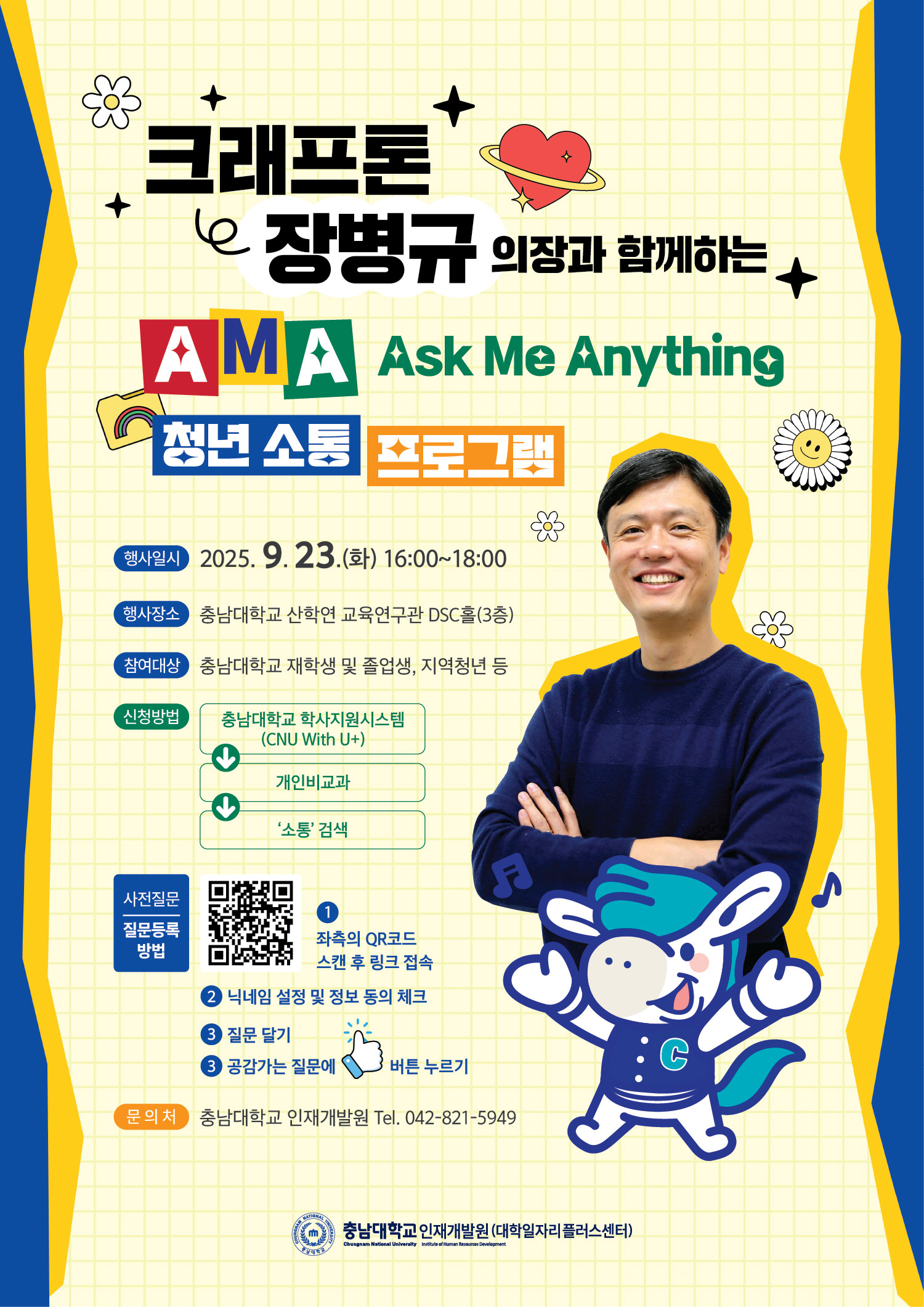 가. 행사개요 1) 일시: 2025. 9. 23.(화), 16:00~18:00 2) 장소: 충남대학교 산학연교육연구관 DSC홀(3층) 3) 대상: 기업인의 인사이트를 얻고 싶은 지역청년 누구나 4) 강연자: 크래프톤 장병규 의장 5) 주요내용 가) (특강) 장병규 의장 커리어 관련 특강 나) (멘토링) 진로‧취업‧산업‧창업‧생활 등 전반에 대한 Q&A 6) 주최/주관: 크래프톤/충남대학교 인재개발원 나. 신청방법: CNU With U+ (학사지원시스템)-개인비교과-‘소통’검색 ※네이버, 카카오 등을 통한 회원가입이 필요합니다. 다. 문의: 충남대학교 인재개발원 최나라(042-821-5949, jobinfo@cnu.ac.kr)
