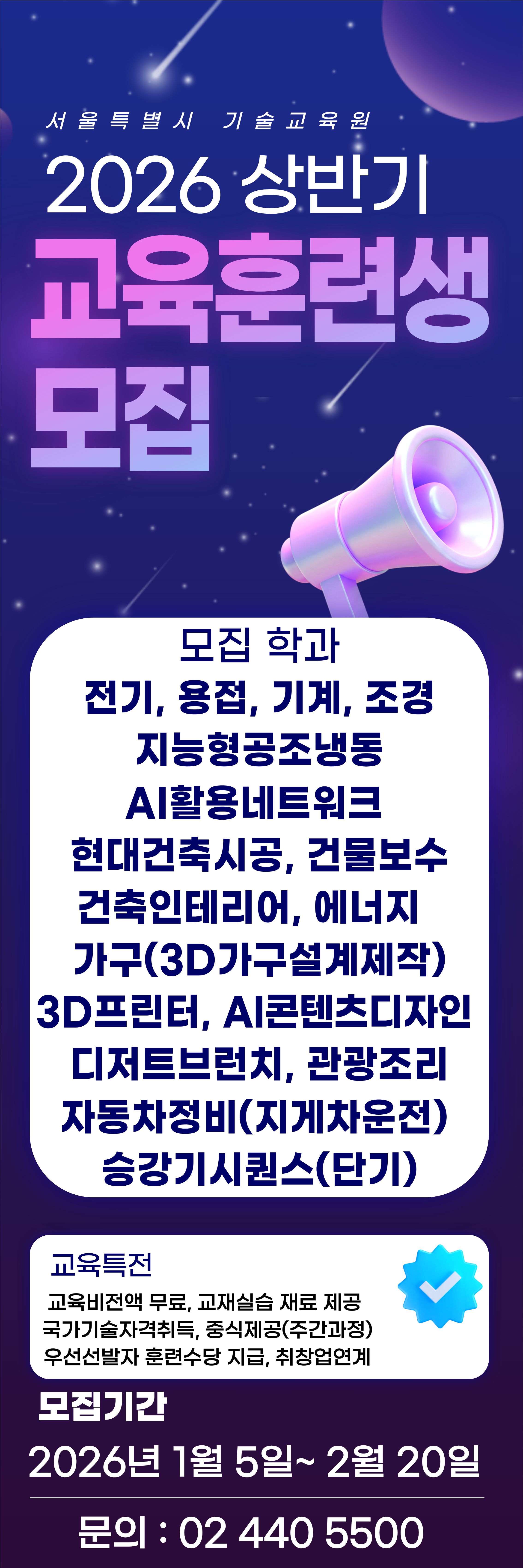 | 제목 | 2026년 상반기 서울특별시 기술교육원 동부캠퍼스 교육훈련생 모집 안내 | ||||