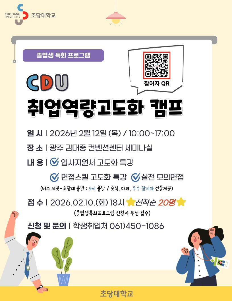 가. 프로그램명: 2026년 CDU 취업역량고도화 캠프 나. 운영기간: 2026. 2.12.(목) 10:00~17:00 다. 참여대상: 만 34세 이하 미취업 청년이면 누구나 라. 모집인원: 20명(선착순 접수) 마. 운영장소: 광주 김대중컨벤션센터 세미나실 바. 운영내용: 1일 완성 취업캠프(입사지원서 및 면접 특강, 모의면접) 사. 지원내용: 버스 제공(초당대 출발, 광주터미널 경유), 중식, 다과, 선물 제공 아. 신청방법: 전화, 구글폼(https://m.site.naver.com/1MVho)