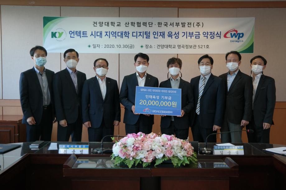 건양대학교 산학협력단과 한국서부발전 주식회사는 지난달 30일 건양대 논산 창의융합캠퍼스에서‘언택트 시대 지역대학 디지털 인재 육성’을 위한 기부금 약정식을 진행했다. 지난 2019년 4차산업 기술협력 및 인력양성을 위한 업무협약을 체결한 양 기관은‘IoT통신망운영 실무자 직무향상 교육 프로그램’을 운영해 20여 명의 수료생을 배출하는 등 지역경제 활성화에 기여하기 위해 교육,취업,연구 등의 분야에서 활발한 산학협력 활동을 추진하고 있다. 이번 행사를 통해 산학협력단은 한국서부발전으로부터 기부금 2000만원을 전달받기로 했으며 이를 디지털 인재 육성을 위한 교육인프라 확충에 활용하기로 했다. 이번 행사는 지역의 거점대학과 핵심 공기업이 지역 산학협력 활성화 동반성장을 위한 협력체계를 구축했다는 점에서 큰 의미를 가진다. 건양대 산학협력단 김웅식 단장은“이번 행사사 한국서부발전과 지역 상생을 위한 협력체계의 초석이 된 것 같아 매우 기쁘다”고 말했다. 한편 2001년 설립된 발전 전문 공기업 한국서부발전은 국내 전력생산량의 10%를 담당하며 발전기자재 및 원천기술 국산화 사업 등을 통해 협력기업 및 지역중소기업과의 동반성장 생태계 조성에 앞장서고 있는 글로벌 에너지 기업이다. |