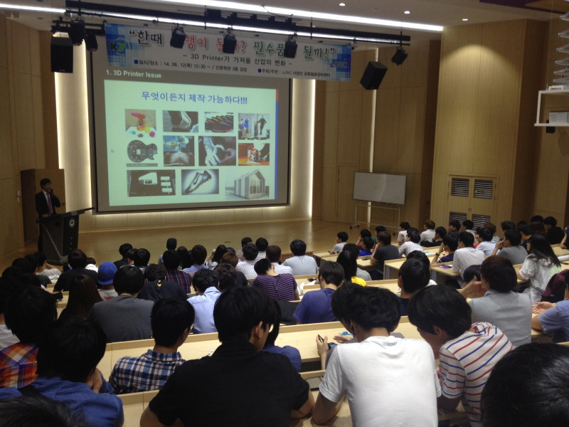 - 일시 : 2014. 6.12(목) 15:30~- 장소 : 인문학관 3층 강당- 강사 : (주)한국기술 이일용 과장- 참석 : 166명 (재학생 및 기타)- 주제 : 3D Printer 가 가져올 산업의 변화
