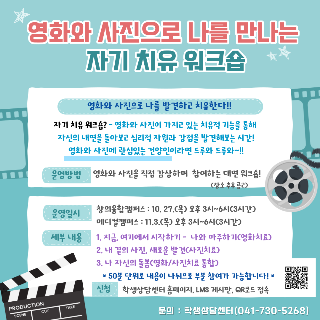 | 제목 | [학생상담센터] 영화와 사진으로 만나는 자기 치유 워크숍 안내 | ||||