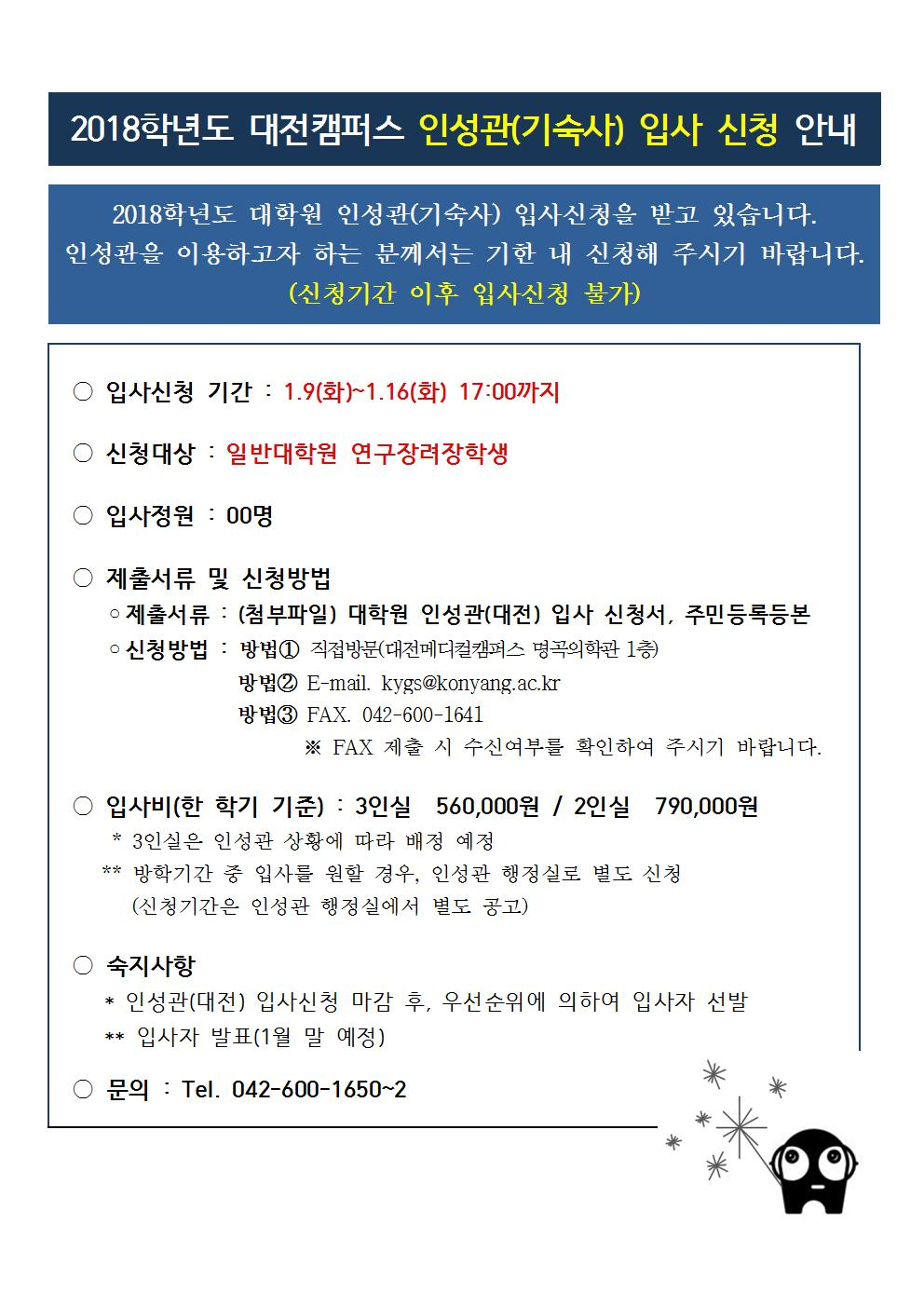 | 제목 | 2018학년도 대전캠퍼스 인성관 입사신청 안내 | ||||