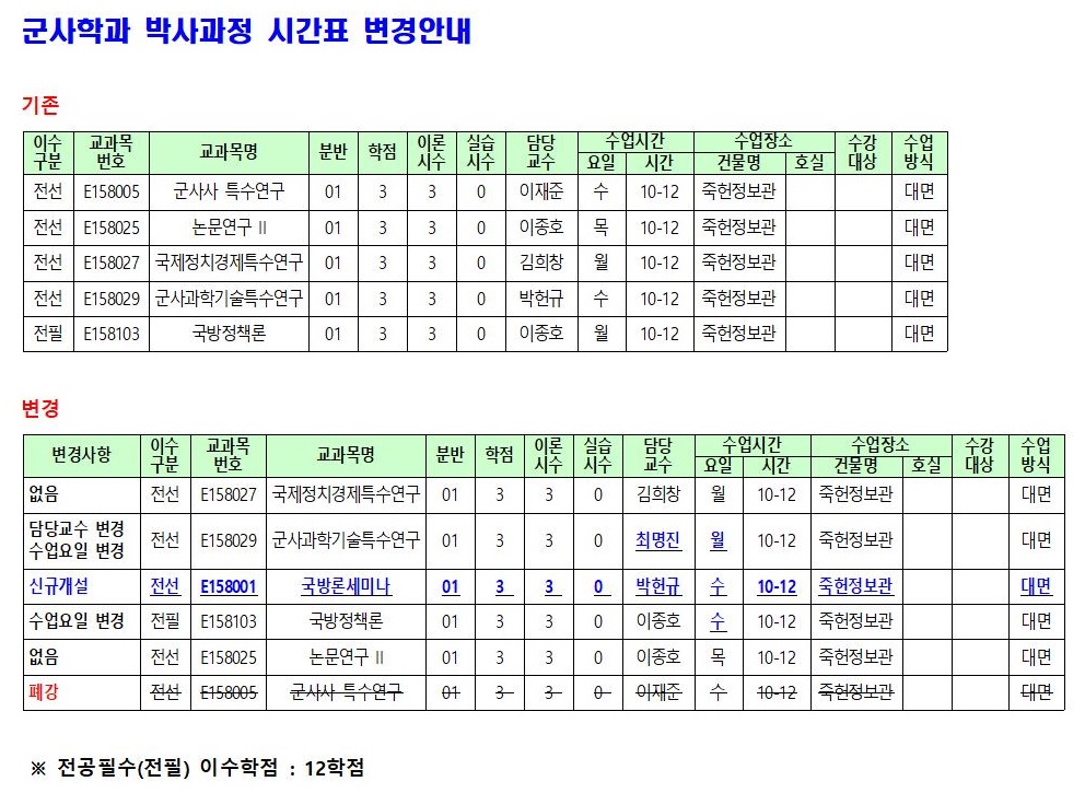2022-2학기 군사학과 박사과정 수업시간표가 일부 변경되었습니다. 아래 변경사항을 참고하시어 수강신청에 차질없으시길 바랍니다.