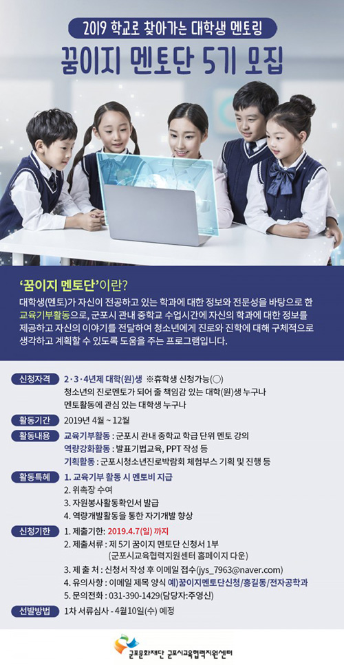 (재)군포문화재단 군포시교육협력지원센터는 자유학기제 사업의 일환으로 ‘꿈이지 멘토단’ 프로그램을 운영합니다. 교육기부활동을 하고자하는 「꿈이지 멘토단」5기 대학생을 아래와 같이 추가 모집하오니 많은 관심부탁드립니다.