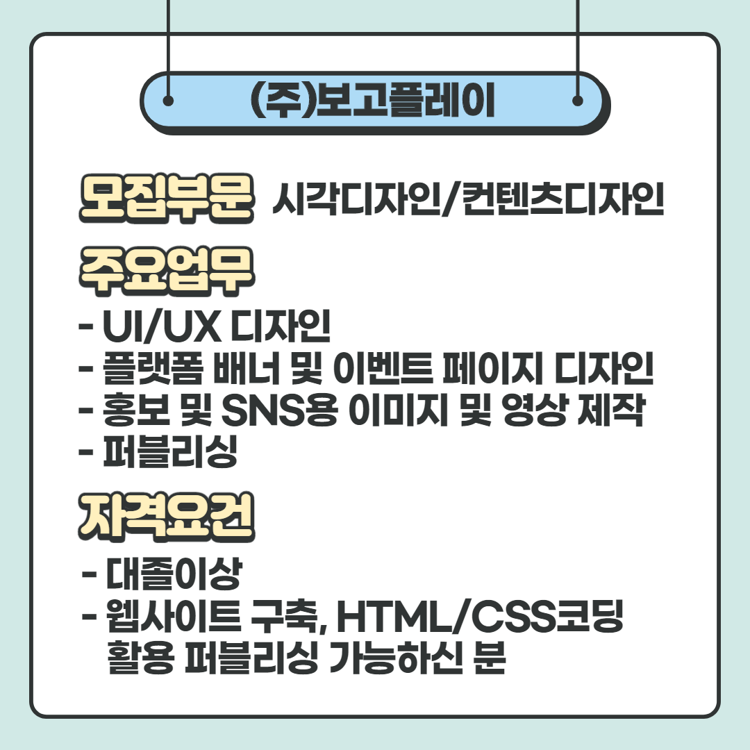 디자인계열 채용 정보를 안내드립니다. - (주)보고플레이 : https://han.gl/qB1Xc - (주)코엔 : https://han.gl/QErI3 |
