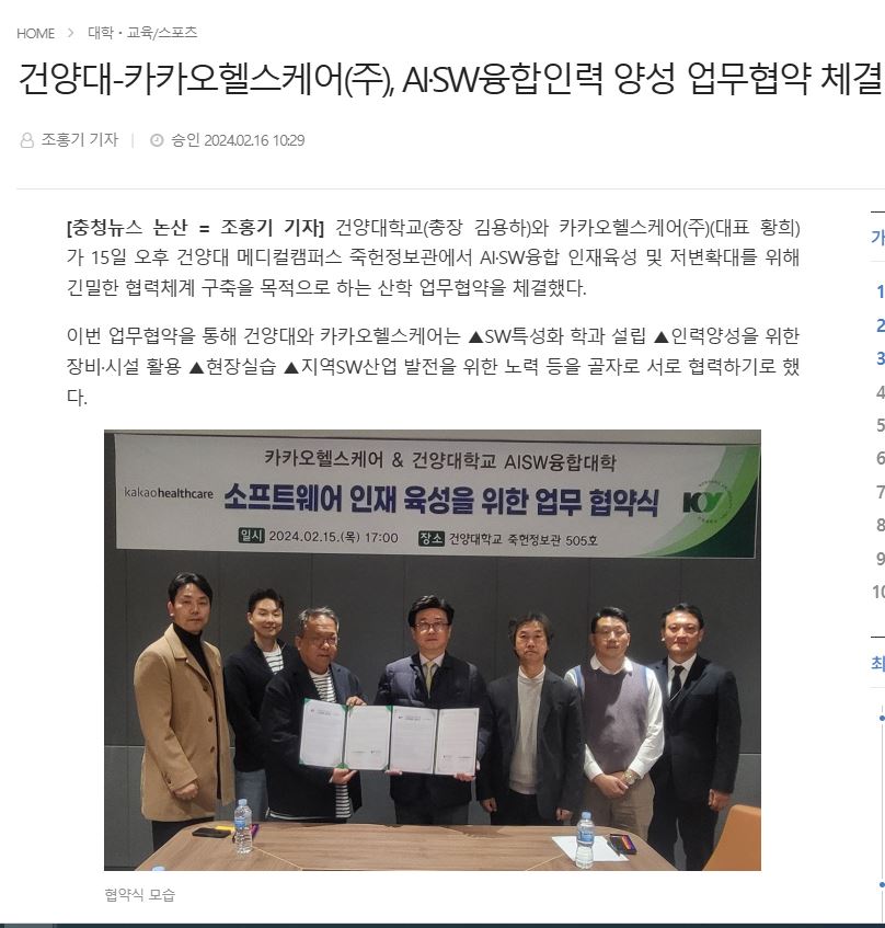 『 건양대-카카오헬스케어(주) 업무협약체결 』글의 상세내용을 확인하는 표로 제목, 부서명, 등록일, 조회, 첨부, 내용으로 나뉘어 설명합니다.