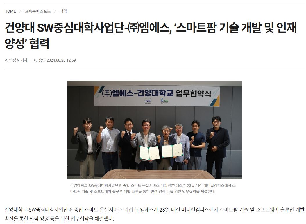 『 건양대 SW중심대학사업단-(주)엠에스 업무협약 체결 』글의 상세내용을 확인하는 표로 제목, 부서명, 등록일, 조회, 첨부, 내용으로 나뉘어 설명합니다.
