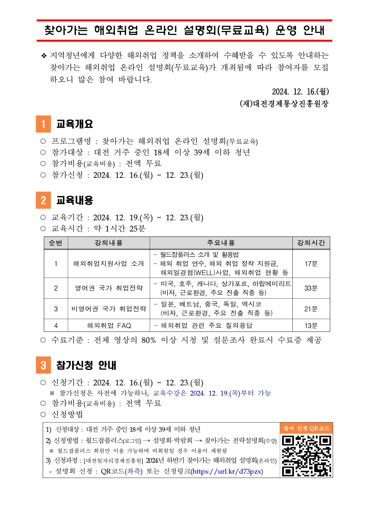 『 찾아가는 해외취업 온라인 설명회(무료교육) 운영 안내 』글의 상세내용을 확인하는 표로 제목, 부서명, 등록일, 조회, 첨부, 내용으로 나뉘어 설명합니다.