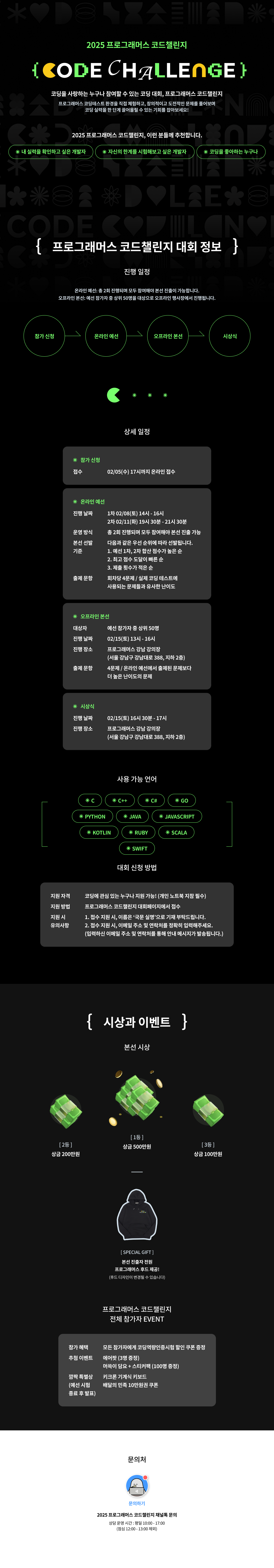 1. 참가신청 o (접수 기간) 2/5(수), 17시까지 o (접수 방법) 프로그래머스 코드챌린지 대회페이지 온라인 접수 ☞ 대회페이지 바로가기 (2025 프로그래머스 코드챌린지) o (지원 자격) 코딩에 관심 있는 누구나 지원 가능 ! * 개인 노트북 지참 필수