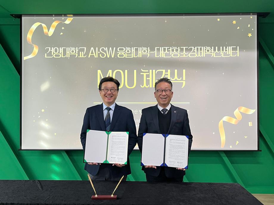 건양대학교, 대전창조경제혁신센터와 지역 창업 활성화 위한 업무협약 체결 – AI·SW 기반 창업 활성화 모델 구축… 창업인재 양성·기술사업화·딥테크 분야 협력 강화 – 건양대학교(총장 김용하) AI·SW융합대학(학장 김용석)은 12월 2일, (재)대전창조경제혁신센터(대표이사 박대희)와 AI 기반 창업 활성화 모델 구축과 지역 창업 생태계 고도화로 지역 창조경제 확산 및 창업 활성화를 위한 **업무협약(MOU)**을 체결했다고 밝혔다. 이번 협약은 대전·충남 지역 창업 생태계의 혁신적 성장을 목표로 양 기관이 보유한 교육·연구·창업지원 역량을 결합해 실질적인 성과 창출을 도모하기 위해 마련됐다. 양 기관은 ▲창업인재 양성과 기술사업화 활성화 ▲산학 연계 창업기업 발굴 및 성장 지원 ▲교육·멘토링·네트워크 행사 공동 추진 ▲2026년 초기창업패키지 딥테크 분야 협력 ▲창업 관련 연구 및 공모사업 공동 대응 등 다양한 분야에서 긴밀히 협력할 계획이다. 특히 건양대학교는 AI·SW 중심 교육혁신과 AX 기반 실습·실증 체계를 보유하고 있어, 학생·지역 예비창업자들이 AI·SW기술을 활용해 문제 해결형 창업 아이템을 개발하고, 시제품 제작·검증·시장 진출까지 이어지는 AI 기반 창업 전체주기 모델을 구축한다는 계획이다. 대전창조경제혁신센터는 창업지원 인프라, 전문 멘토단, 투자·실증 네트워크를 기반으로 대학이 발굴한 기술·인재와 연결해 실질적인 성과 창출을 돕기로 협의하였다. 김용석 학장은 “AI는 산업의 패러다임을 바꾸는 핵심 기술이며, 대학은 이러한 시대 변화에 대응할 창업 인재 양성의 중심 역할을 수행해야 한다”며, “이번 협약을 통해 대학의 AI 교육 역량과 센터의 창업지원 역량이 결합한 AI 기반 창업 활성화 모델을 본격 구축하겠다”고 밝혔다.