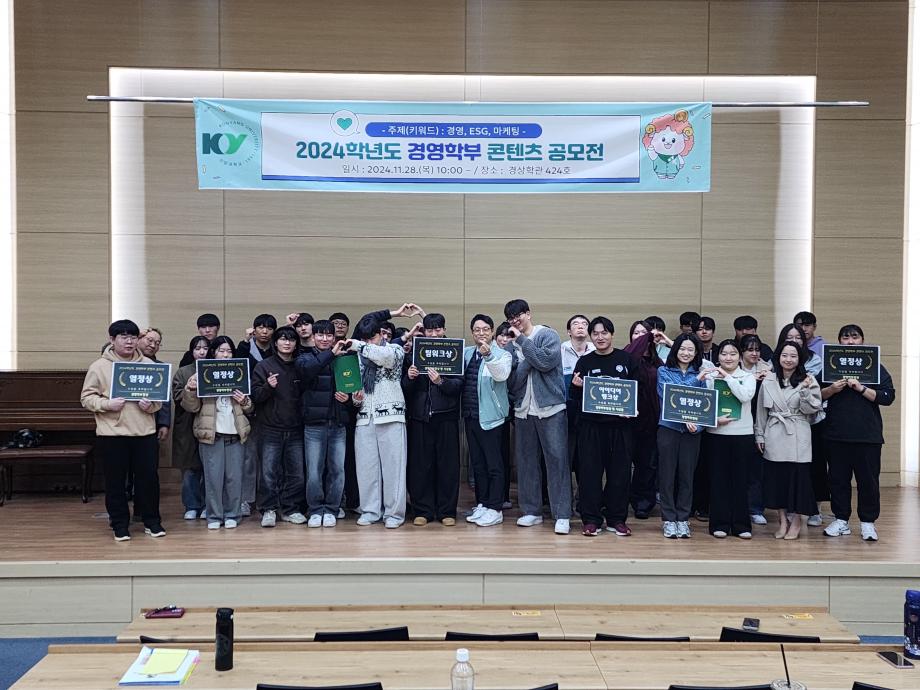 2024년 11월 28일(목) 2024학년도 경영학부 콘텐츠 공모전이 성황리에 마무리되었습니다! 이번 공모전은 경영, ESG, 마케팅 분야를 주제로 하여 총 18팀이 참가하였으며, 치열한 경쟁 끝에 6팀이 수상의 영광을 안았습니다. 1등인 팀워크 상은 '코로나팬데믹이후 단체교섭 이후 우리나라 자동차 제조 기업 단체교섭 사례분석'을 주제로 한 '경영LIFE팀'이 수상하였습니다. 이 팀은 경영 사례 분석을 면밀히 분석하고 발전 방안을 구체적으로 제시하여 높은 평가를 받았습니다 2등인 아이디어 뱅크 상은 '레고의 소비자분석과 마케팅 전략수립'을 주제로 한 '고구려제백신라팀'이 수상하였습니다. 이 팀은 시장 분석과 타겟팅, 마케팅 전략 수립 등을 통해 효과적인 마케팅 방안을 제시하여 좋은 평가를 받았습니다. 3등인 열정상은 '경영'을 주제로 한 '한배탔조', '짜요, 加油팀', '만루홈런팀', '2조팀'이 각각 수상하였습니다. 이번 공모전을 통해 학생들은 자신의 창의적인 아이디어를 발휘하고, 경영학에 대한 이해도를 높일 수 있었습니다. 또한, 다른 학생들과 함께 협업하며 소통하는 능력을 키울 수 있었습니다. 공모전을 준비하신 모든 학생들과 교수님들께 감사드리며, 건양대학교 경영학부는 앞으로도 학생들의 창의적인 역량을 발휘할 수 있는 다양한 기회를 제공할 예정입니다. 감사합니다. |