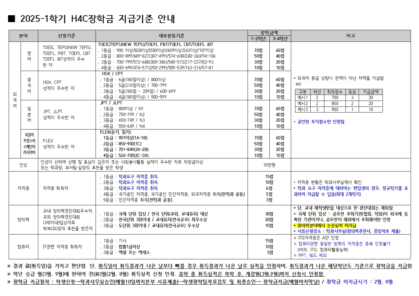 『 [자주하는질문] H4C장학금 신청 및 지급기준 안내 』글의 상세내용을 확인하는 표로 제목, 부서명, 등록일, 조회, 첨부, 내용으로 나뉘어 설명합니다.