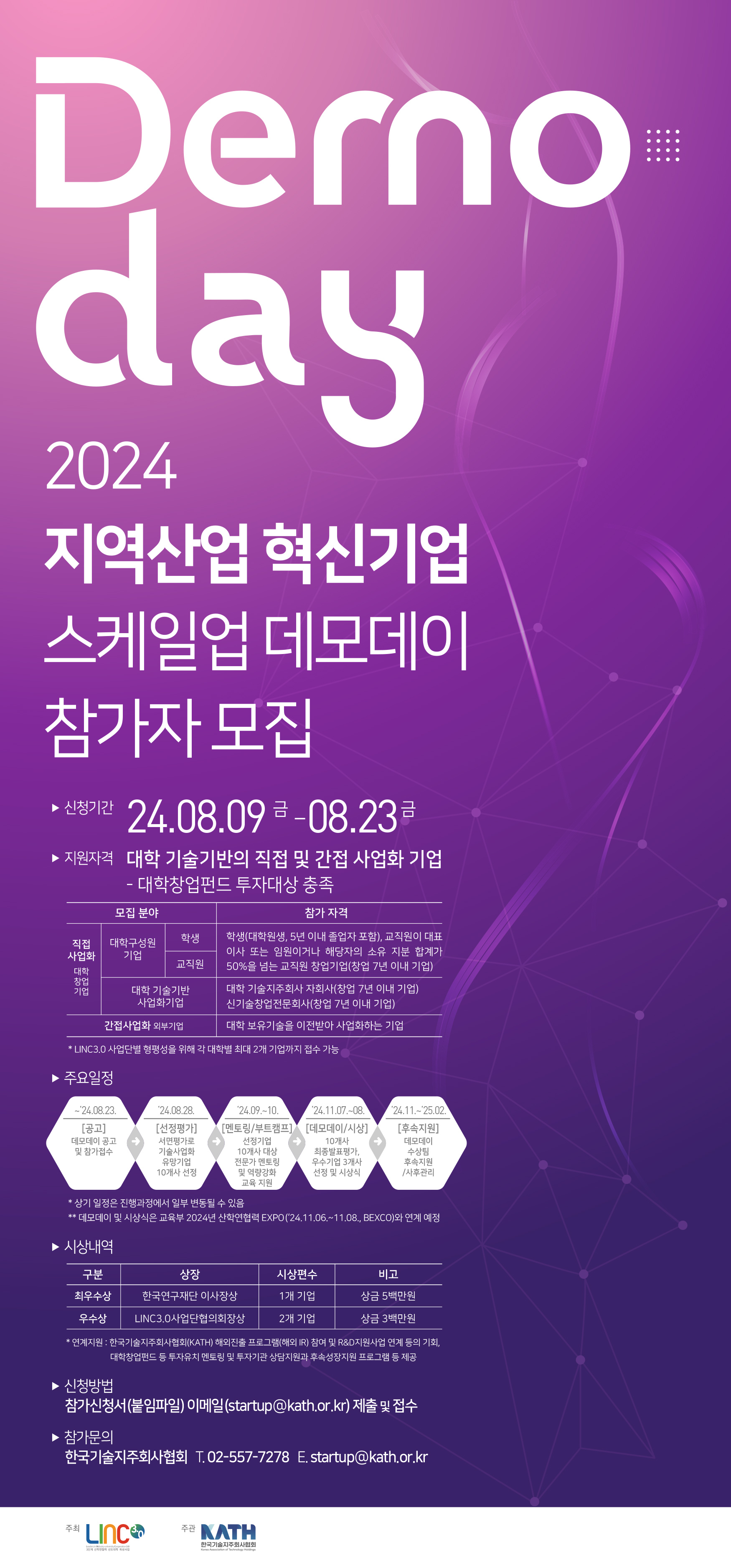 3. 데모데이 신청 및 접수 가. 접수기간 : 2024. 8. 9.(금) ~ 8. 23.(금) 24:00 나. 제출서류 -참가신청서, 기술사업화 요약서, 정보수집 및 이용동의서 등 *대학 산학협력단 또는 LINC3.0사업단 등으로부터 추천서를 받아 첨부하는 것을 권장함 다. 접수방법 : 전용 이메일(startup@kath.or.kr)을 통한 온라인 접수 라. (필수확인) LINC3.0 사업단별 형평성을 위하여 대학별 최대 2개 기업까지 접수 가능 마. 문 의 처 : 한국기술지주회사협회 사무국 김도성 사무국장(T.02-2063-4011)
