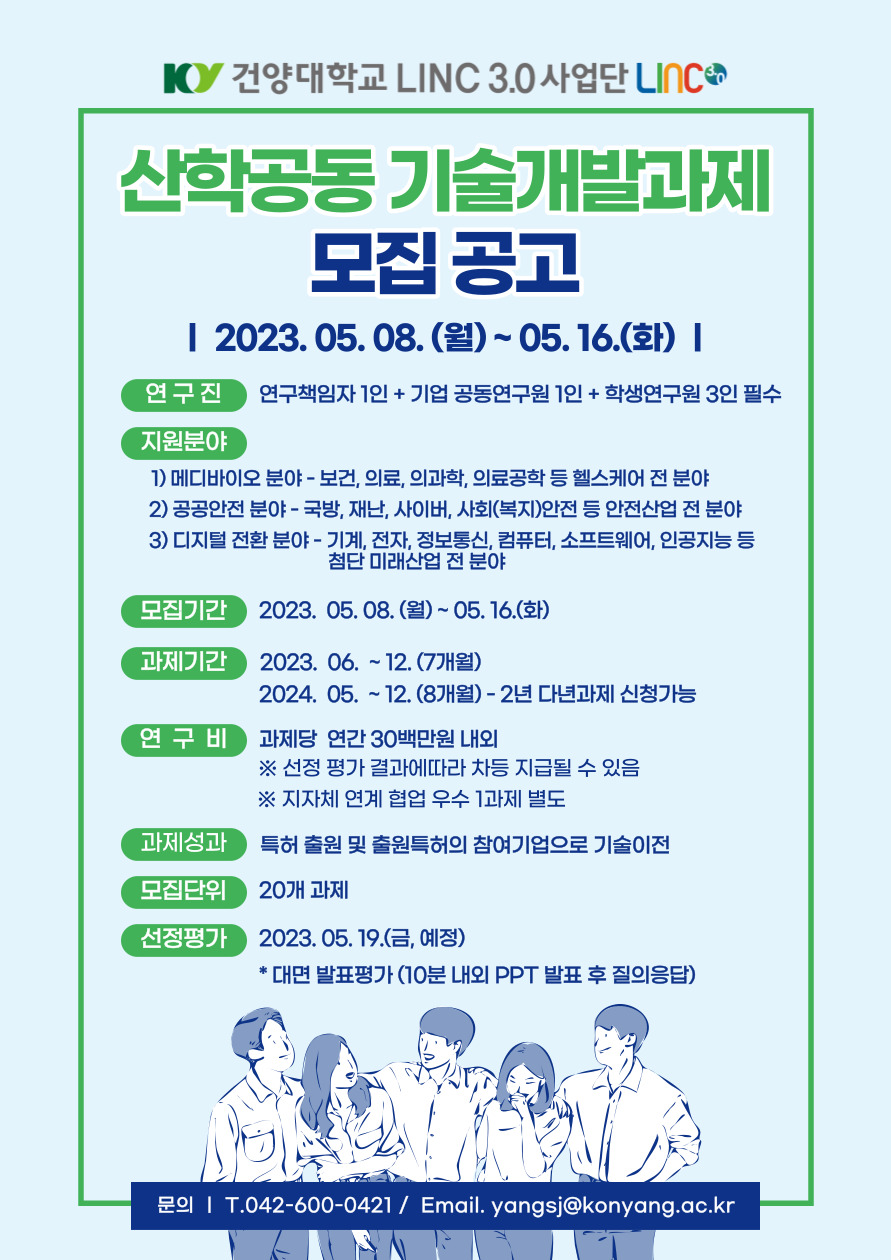 - 신청기간 : 2023.05.08(월) ~ 05.16.(화) - 제출처 : linc3@konyang.ac.kr(첨부서식 이메일 제출) - 문의처 : LINC 3.0 사업단 기업지원실(042-600-0421) * 자세한 내용은 첨부파일을 참고하여 주시기 바랍니다.