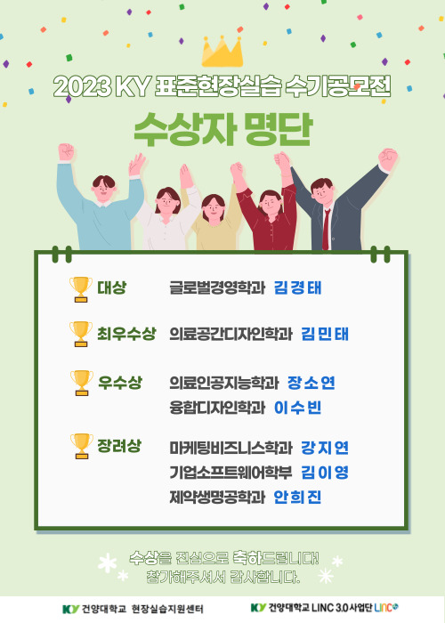 2023 KY 표준현장실습 수기공모전 수상 결과를 아래와 같이 안내드립니다.