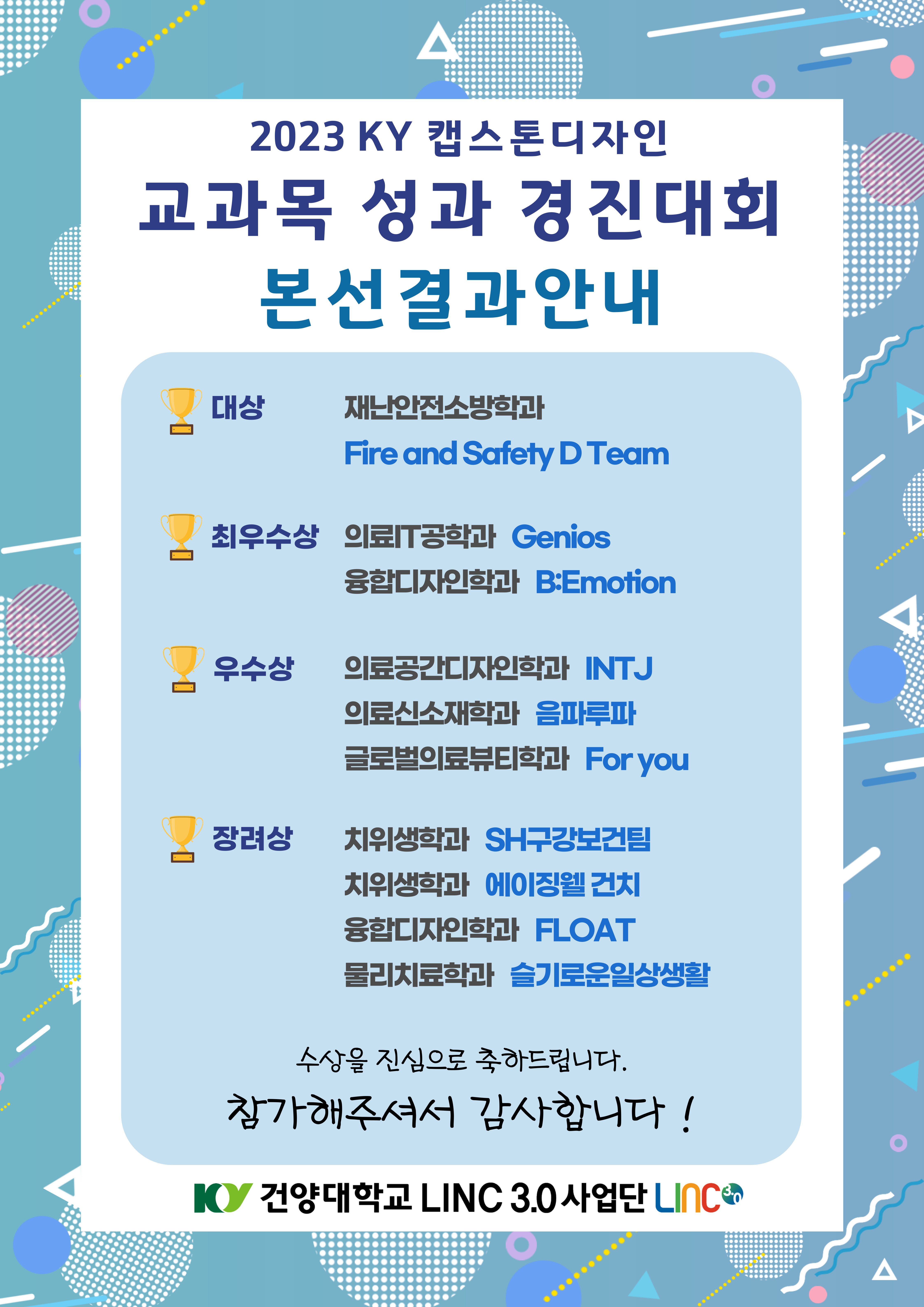 건양대학교 LINC 3.0 사업단 2023 KY 캡스톤디자인 교과목 성과 경진대회 수상 결과를 아래와 같이 안내드립니다. 참가해주신 모든 분께 감사드립니다. * 상금 지급과 관련하여 수상팀 대표 학생에게 개별 연락 예정입니다. *