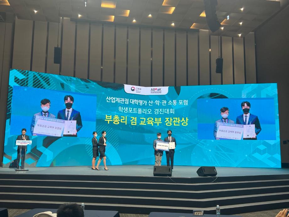 지난 2일부터 4일까지 수원컨벤션센터 3층 컨벤션홀에서 열린‘2022년 산학협력 엑스포’에 참여하고 있는 건양대학교 LINC3.0사업단과 공학교육혁신센터이 연이은 수상소식을 전하며 산학연계 교육 성과를 보이고 있다. ‘산학협력 EXPO LINC 3.0 페스티벌’을 통해 전시·출품되고 있는 건양대 의공학부 4년 김범수·장건호 학생의 작품‘ 전자의무기록시스템 연동 바이탈 사인 계측장치’가 한국연구재단 캡스톤 디자인 우수상을 수상한데 이어 포트폴리오 경진대회에서도 교육부장관상(대상)을 받는 2관왕의 성과를 냈다. 또 의료IT공학과 4년 권택상 학생도 4년간의 교과활동과 비교과활동을 창의적으로 구성한 포트폴리오로 좋은 평가를 받아 한국공학교육인증원장상(우수상)을 수상했다. 이날 학생들의 수상과 함께 이들 학생들에게 개별 컨설팅 등을 진행해 성과를 이끌어 낸 건양대 조용석 공학교육혁신센터장(의료IT공학과 교수) 또한 지도교수상을 받았다. 앞서 2일 열린‘1인 크리에이터 동영상 콘텐츠 경진대회’에서도 건양대 글로벌의료뷰티학과 3년 장민혜 학생이 우수상을 수상했다.