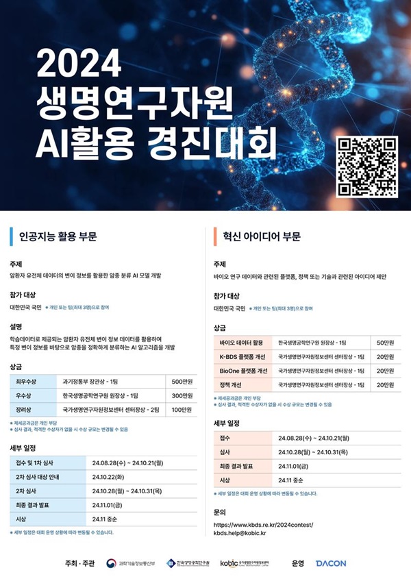 『 2024 생명연구자원 AI활용 경진대회 』글의 상세내용을 확인하는 표로 제목, 부서명, 등록일, 조회, 첨부, 내용으로 나뉘어 설명합니다.
