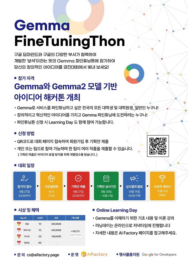 『 Gemma Fine Tuning Thon 아이디어 해커톤대회안내 』글의 상세내용을 확인하는 표로 제목, 부서명, 등록일, 조회, 첨부, 내용으로 나뉘어 설명합니다.
