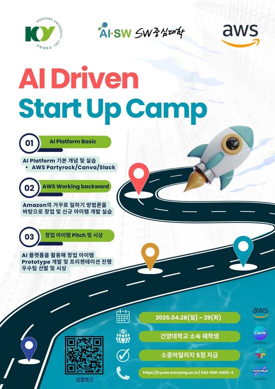 [ AI Driven Start Up Camp - SW창업캠프 ] - 기간 : 2025. 04. 28.(월) ~ 04. 29.(화) / 장소 추후 공지 예정 - 주제 : AI 플랫폼을 활용한 창업 아이템 개발 및 실습 중심의 창업캠프 - 내용 ① AI Platform Basic : AI 플랫폼의 기본 개념 및 학습 (AWS Partyrock, Canva, Slack) ② AWS Working Backward : Amazon의 '거꾸로 일하기'방법론을 바탕으로 창업아이디어 도출 및 신규 아이템 개발 실습 ③ 창업 아이템 Pitch 및 시상 : AI 플랫폼 기반 창업아이템 PRototype 개발, 팀별 프레젠테이션 및 우수팀 시상 - 비고 : 이수시 소중마일리지 5점 지급