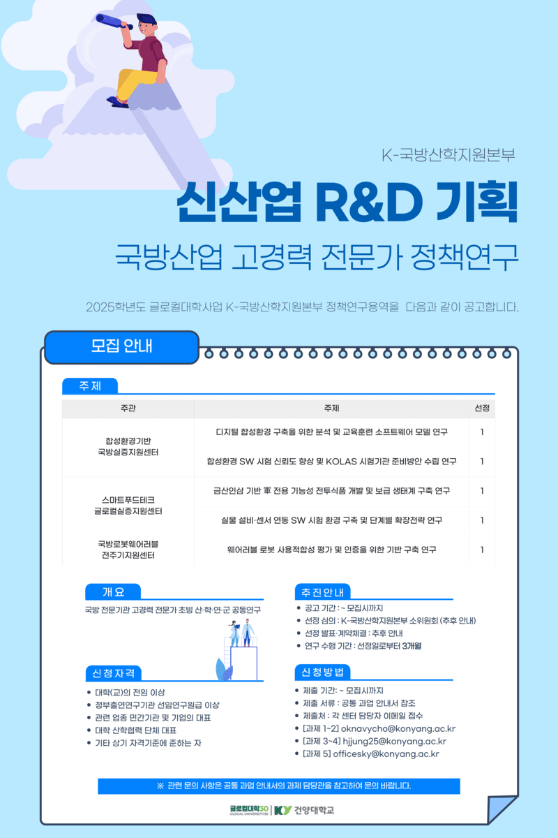 제목 [글로컬대학사업] 2025 신산업 R&D 기획 국방산업 고경력 전문가 정책연구 재공고(~ 모집시까지)